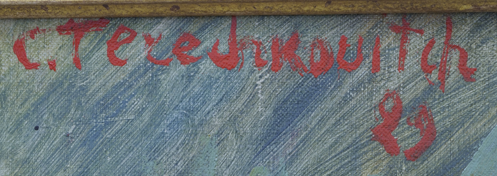 Kostia Terechkovitch, geboren in Moskou, woonde vrijwel zijn hele leven in Frankrijk. Hij schilderde figuren, landschappen en stillevens, was ook dichter, lithograaf, kostuumontwerper en keramist. Geboren in een Europees georiënteerd Russisch gezin had hij al vroeg toegang tot privécollecties, waar hij het werk van de vernieuwende Franse schilders Manet, Matisse, Renoir, Van Gogh leerde kennen. Hij besluit om schilder te worden, begint in 1917 een studie aan de academie van Moskou, en vlucht drie maanden later al naar Parijs. Samen met andere Centraal-Europese kunstenaars werkt hij in het fameuze ateliergebouw 'La Ruche' in Montparnasse. Hij neemt vanaf 1925 deel aan de Salon d’Automne en al snel wordt hij gevraagd voor groepsexposities in Parijse galeries. Met Russische kunstenaars als Chagall, Soutine en Zadkine neemt hij in 1929 deel aan een expositie in Musée Trétiakov in Moskou. Terechkovitch reist veel, ontmoet veel tijdgenoten en schildert vanaf de jaren 40 hoog gewaardeerde portretten van Soutine, Bonnard, Rouault, Raoul Dufy, Matisse, Derain, Van Dongen en Braque. Zijn stijl wordt gekenmerkt door korte penseelstreken en felle kleuren, waarin purperrood, oranje, kobaltblauw en citroengeel overheersen samen met zinkwit en ivoorzwart. Na 1945 is zijn belangrijkste thema het huiselijk leven met zijn vrouw Yvette en twee dochters. Hij reist veel, bezoekt alle Olympische spelen en koopt een racepaard, wat tal van voorstellingen van wedstrijden en paarden oplevert. In 1961 viert hij zijn eerste successen in New York met een solotentoonstelling in de galerie Acquavella.