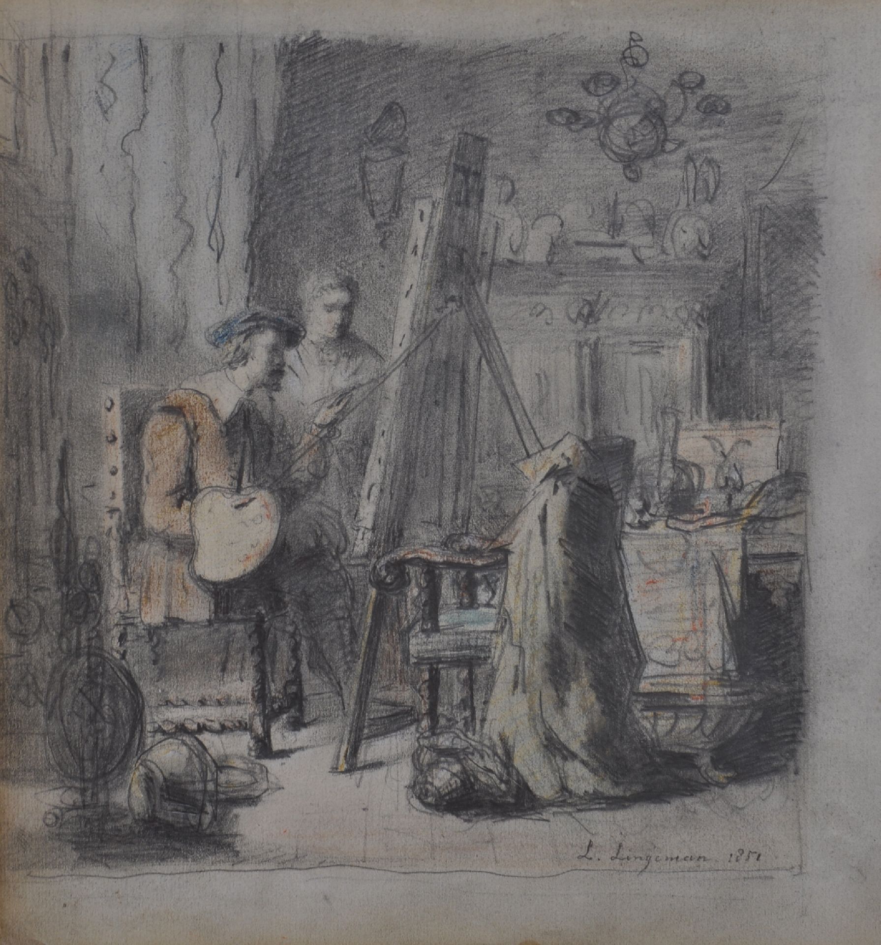potlood en krijt op papier 22,4 x 20,8 cm, gesigneerd rechtsonder en gedateerd 1852