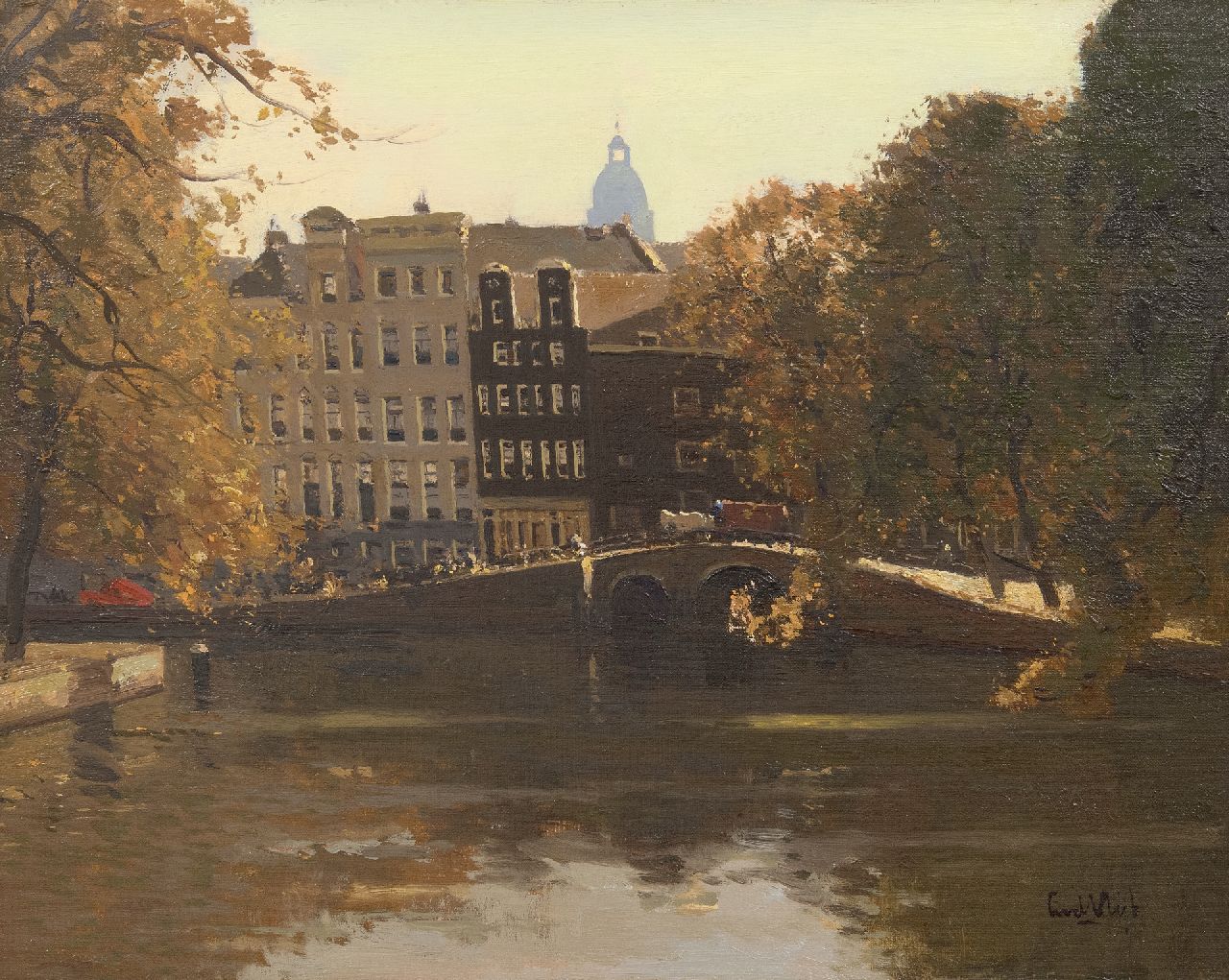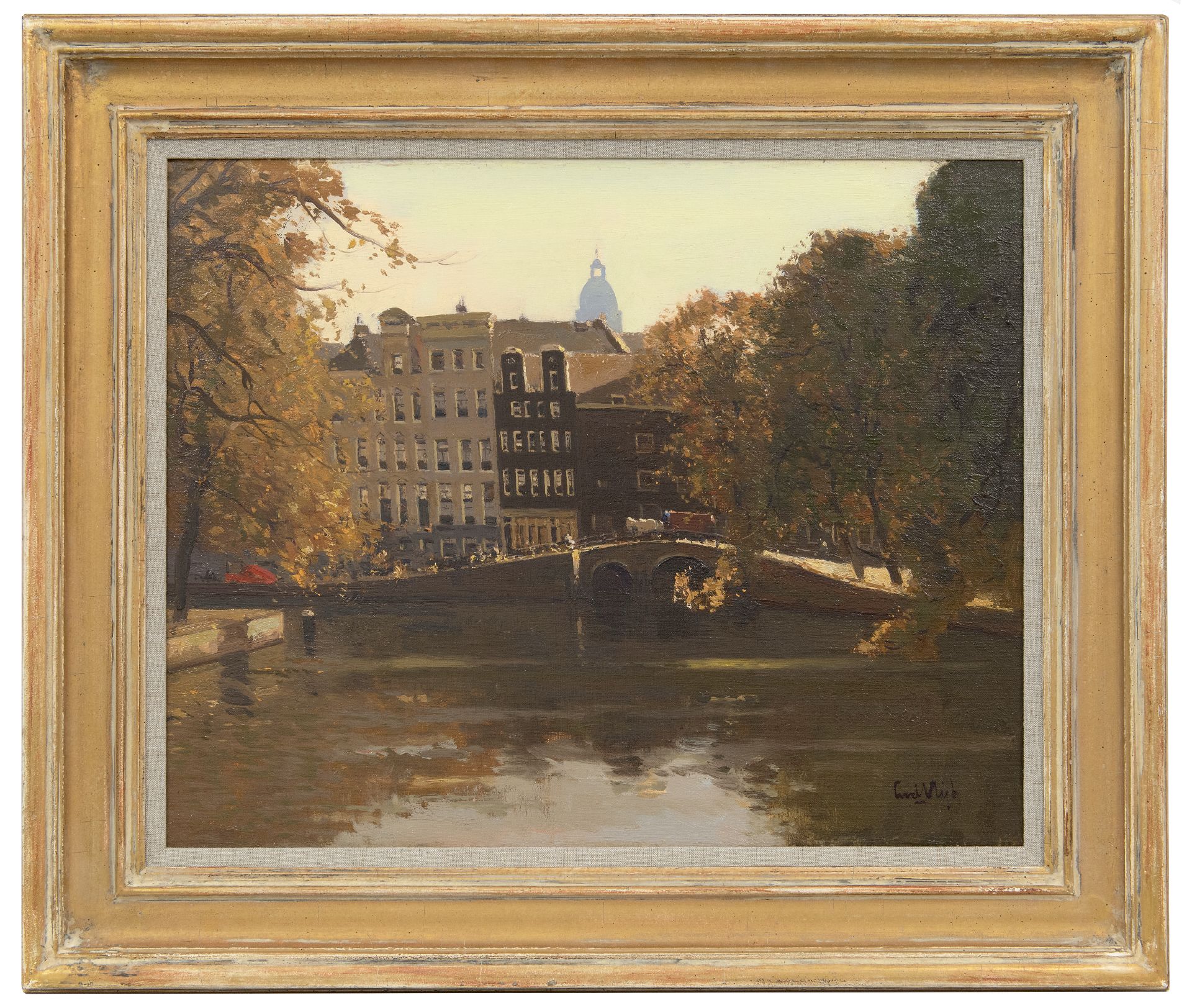 Leendert van der Vlist kunstwerk • schilderij • te koop Gezicht op de Herengracht in Amsterdam met de koepel van Metz & Co