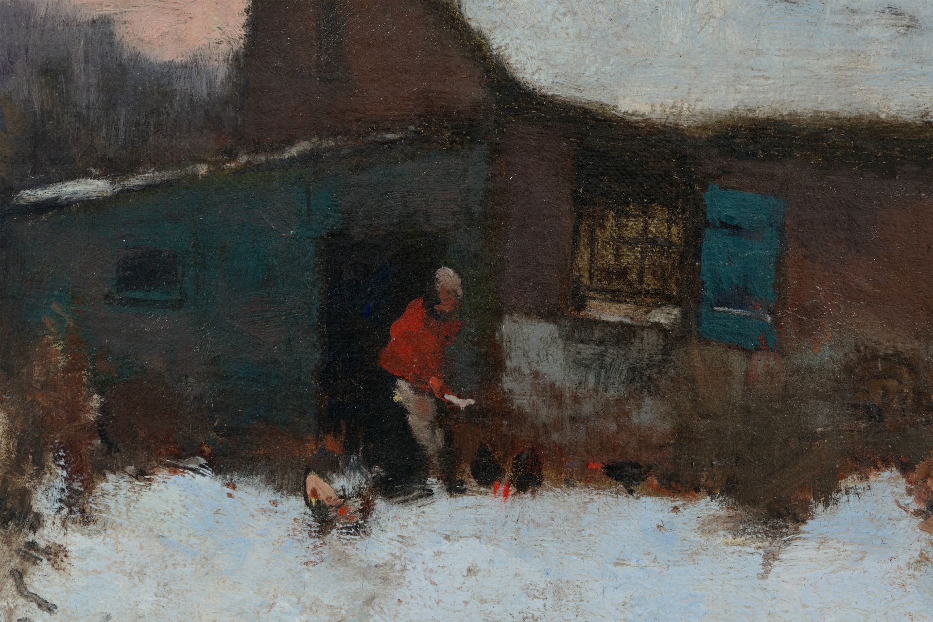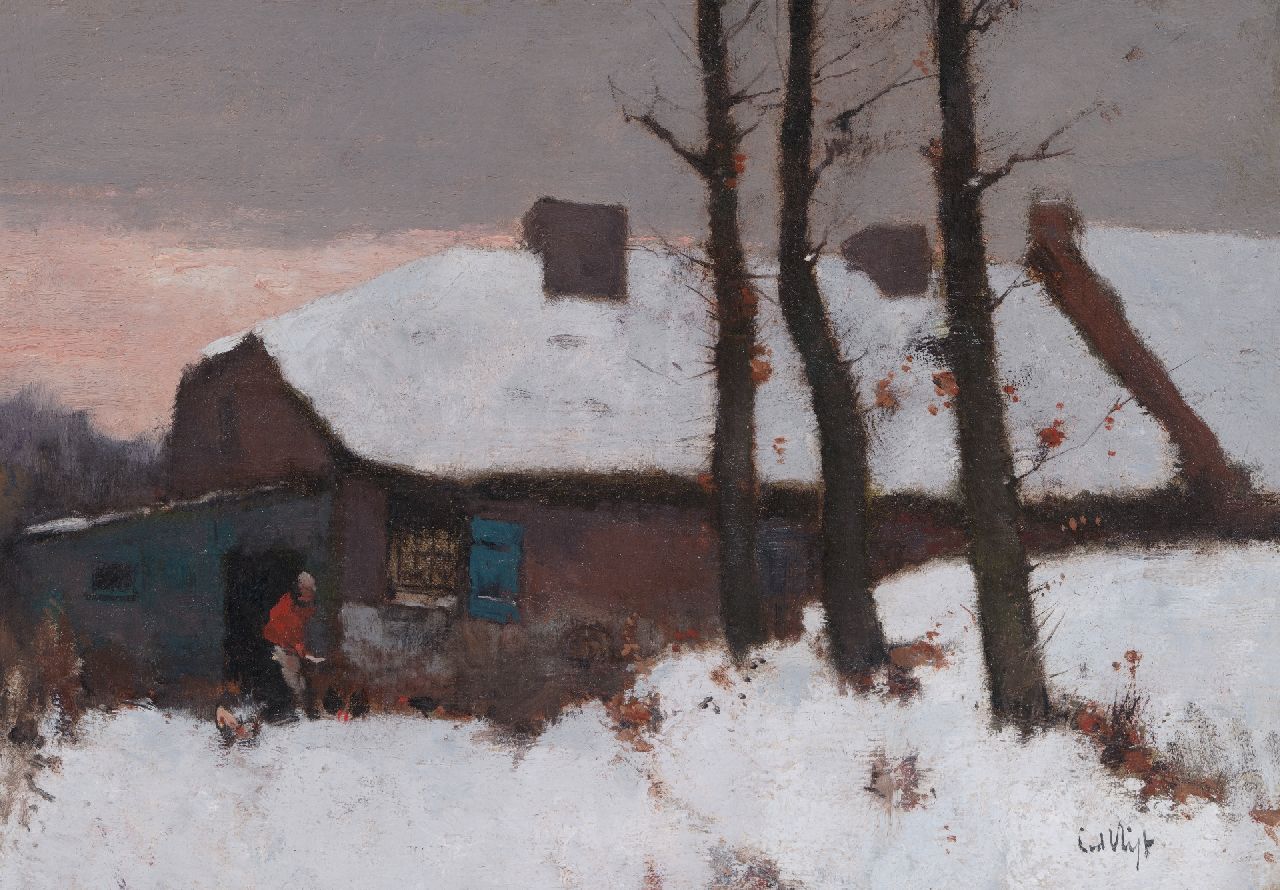Leendert van der Vlist kunstwerk • schilderij • te koop Kippen voeren in de sneeuw