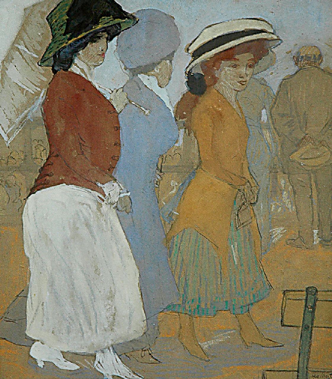 Leo Gestel kunstwerk • aquarel • tekening • voorheen te koop Drie vrouwen op de boulevard van Scheveningen