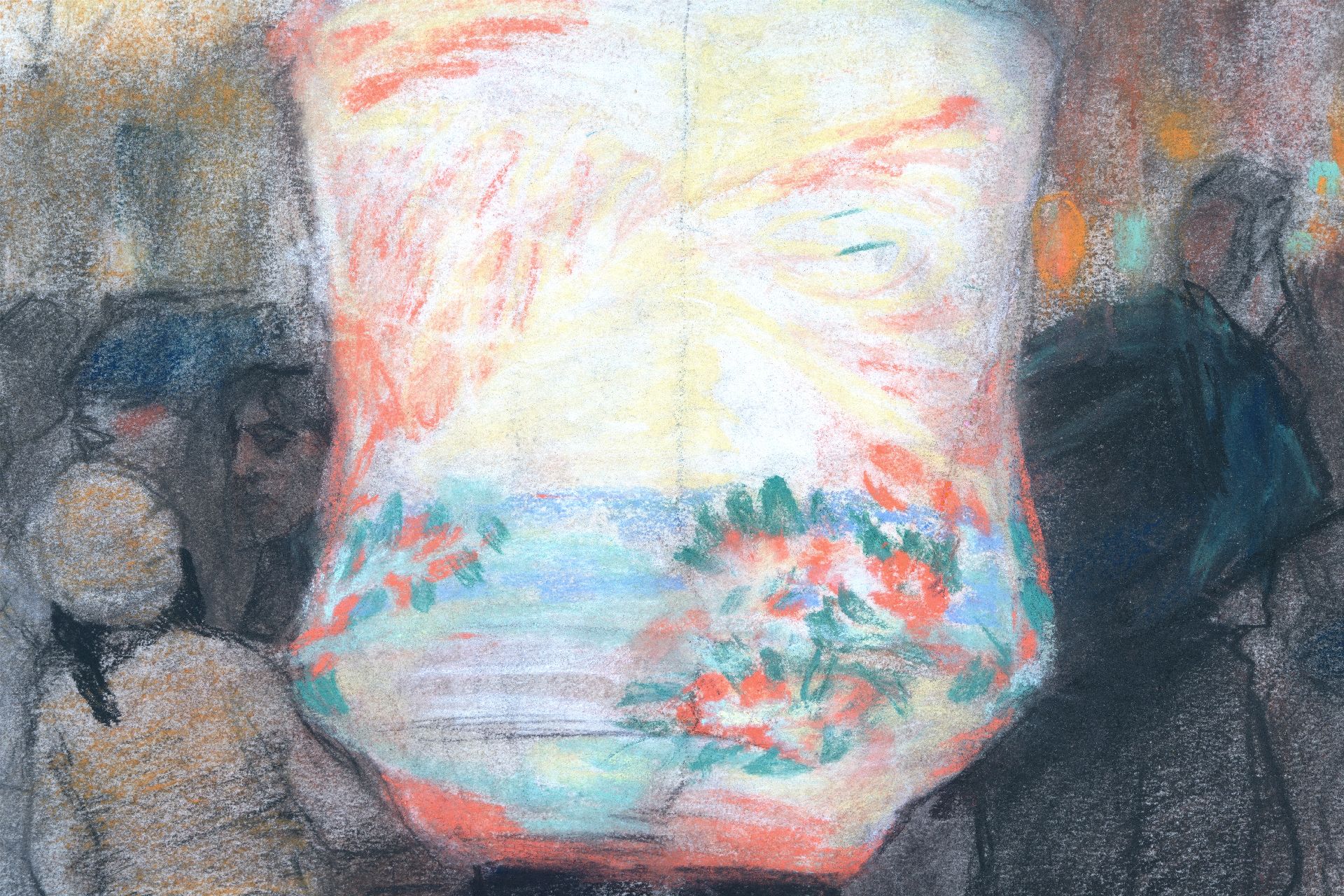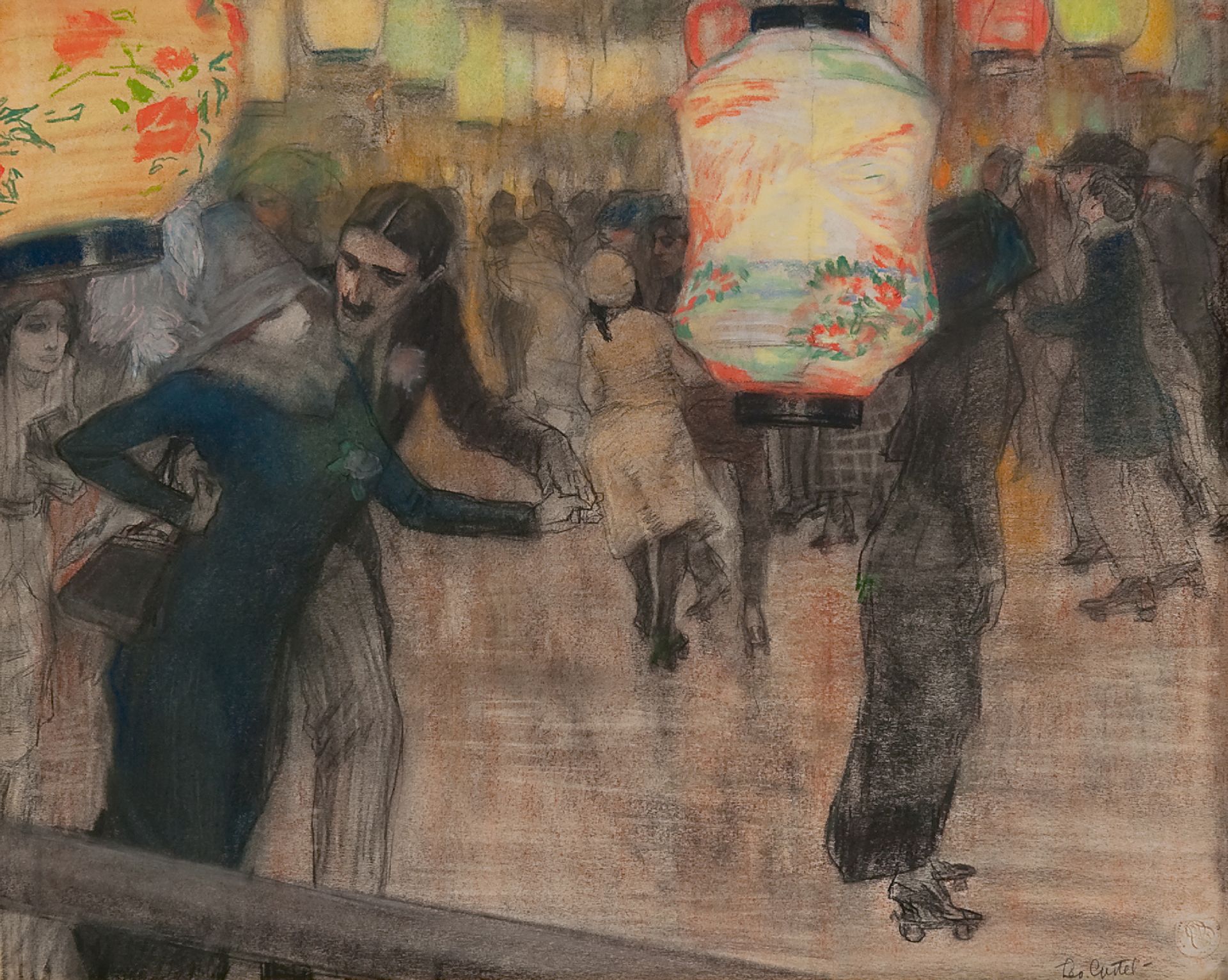 Leo Gestel kunstwerk • aquarel • tekening • voorheen te koop Op de rolschaatsbaan met Japanse lampions