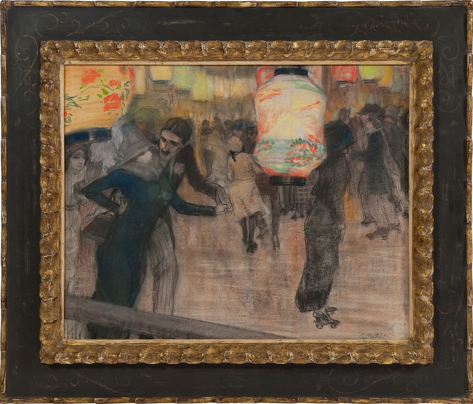 Gestel was een virtuoos tekenaar. Het liefst maakte hij tekeningen in krijt en pastel van elegante vrouwen en het mondaine uitgaansleven van Amsterdam rondom het Rembrandtplein. De hier afgebeelde pastel moet omstreeks 1910 zijn gemaakt nadat Gestel, samen met Jan Sluijters, een aantal jaren Parijs had bezocht en daar elegante vrouwen en het mondaine uitgaansleven had vastgelegd. Opvallend is de compositie, waarbij centraal in het beeldvlak de ruimte open gelaten is en de figuren zich concentreren langs de rand van de voorstelling. Gestel creëert daarmee de illusie van een ronddraaiende beweging, die in gang gezet wordt door het aanrijdende paar links: de man in jacquet, de vrouw in wandelkostuum met grote hoed, bontstola en tas. Het rolschaatsen was omstreeks 1910 meer een modieus tijdverdrijf voor dames en heren van goede afkomst dan een sport voor het volk. Naar het voorbeeld van Parijs, Londen en Berlijn had Amsterdam in 1897 zijn eerste rolschaatsbaan gekregen. Maar van een echte rage was pas sprake omstreeks 1910. In het Paleis voor Volksvlijt op het Frederiksplein werd een luxe rollerbaan aangelegd, met een orkest en een toneel waarop shows werden opgevoerd. Mogelijk werd deze pastel daar gemaakt.