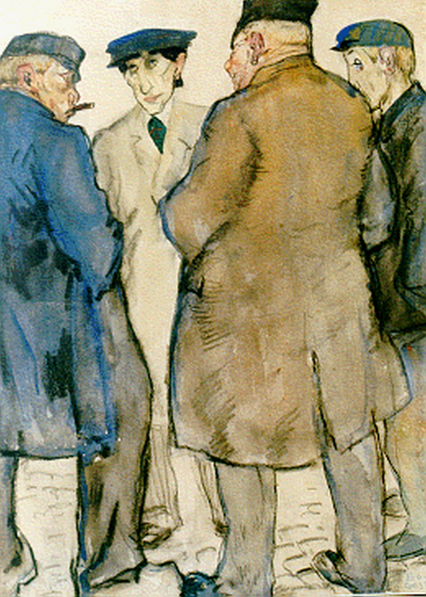 Leo Gestel kunstwerk • aquarel • tekening • voorheen te koop Vier handelaren op de veemarkt in Woerden