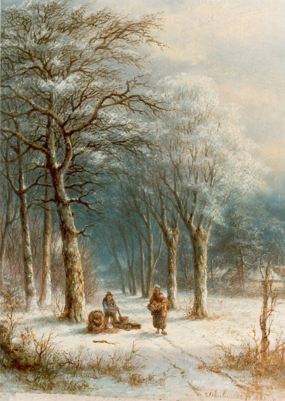 Lion Schulman kunstwerk • schilderij • voorheen te koop Houtsprokkelaars op winterse bosweg