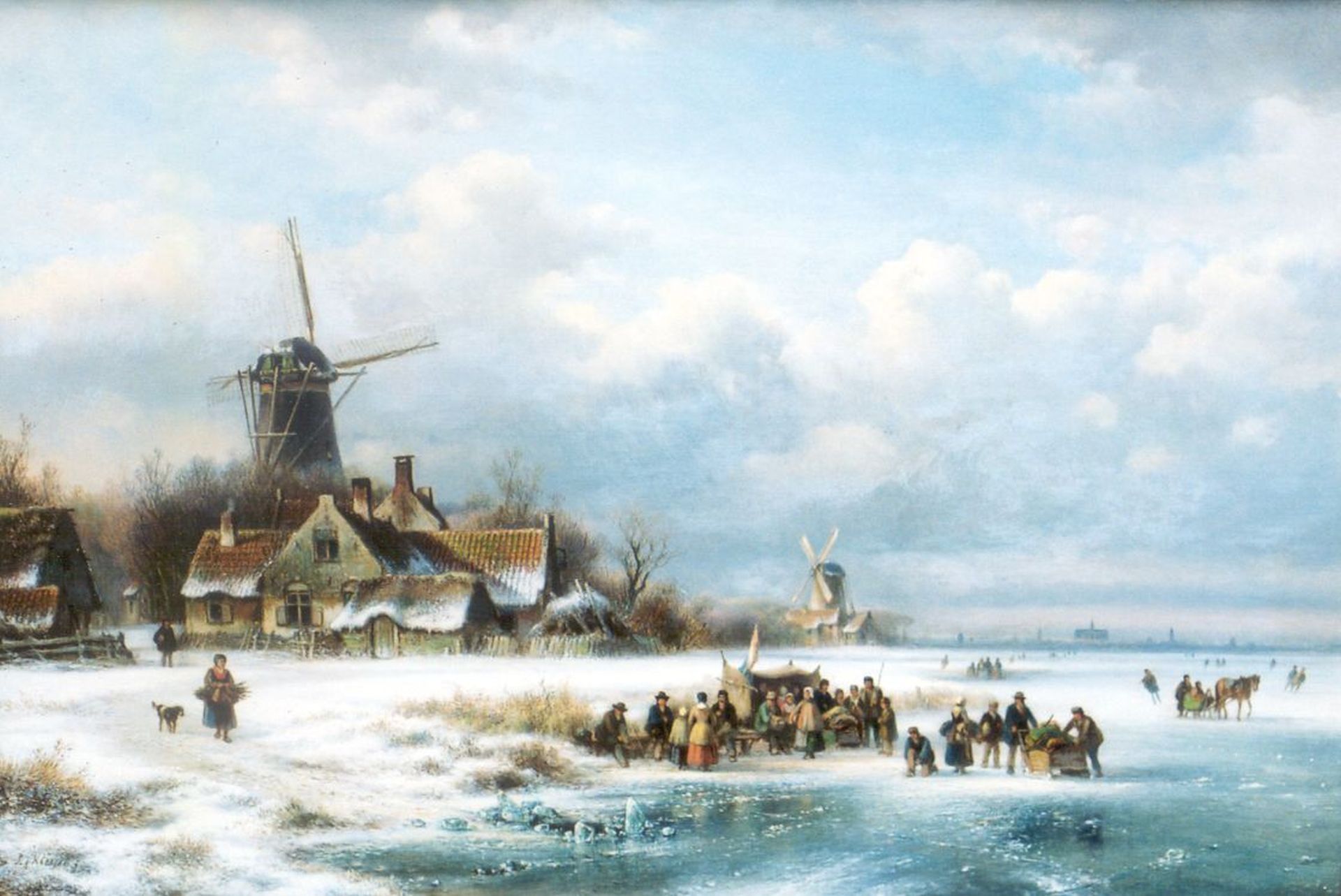 Lodewijk Johannes Kleijn kunstwerk • schilderij • voorheen te koop Bedrijvigheid op een bevroren rivier met koek-en-zopie