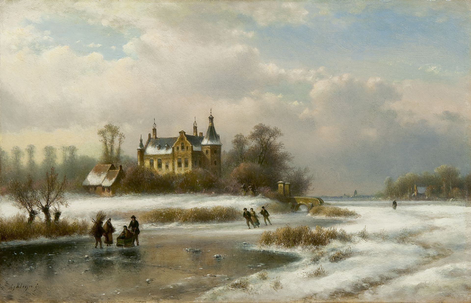 Lodewijk Johannes Kleijn kunstwerk • schilderij • voorheen te koop Bevroren vaart met schaatsers bij een kasteel