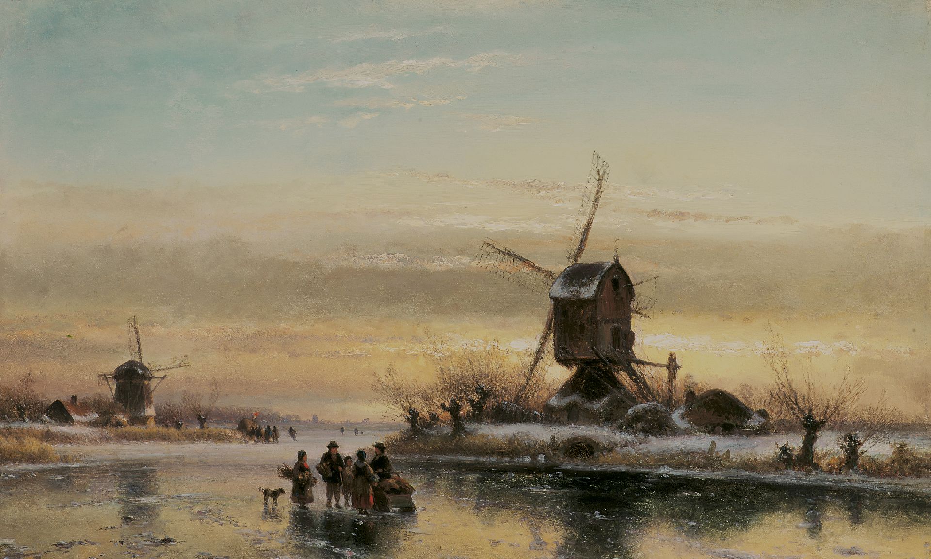 Lodewijk Johannes Kleijn kunstwerk • schilderij • voorheen te koop Houtsprokkelaars en schaatsers op het ijs bij een molen (alleen tezamen met 15220)