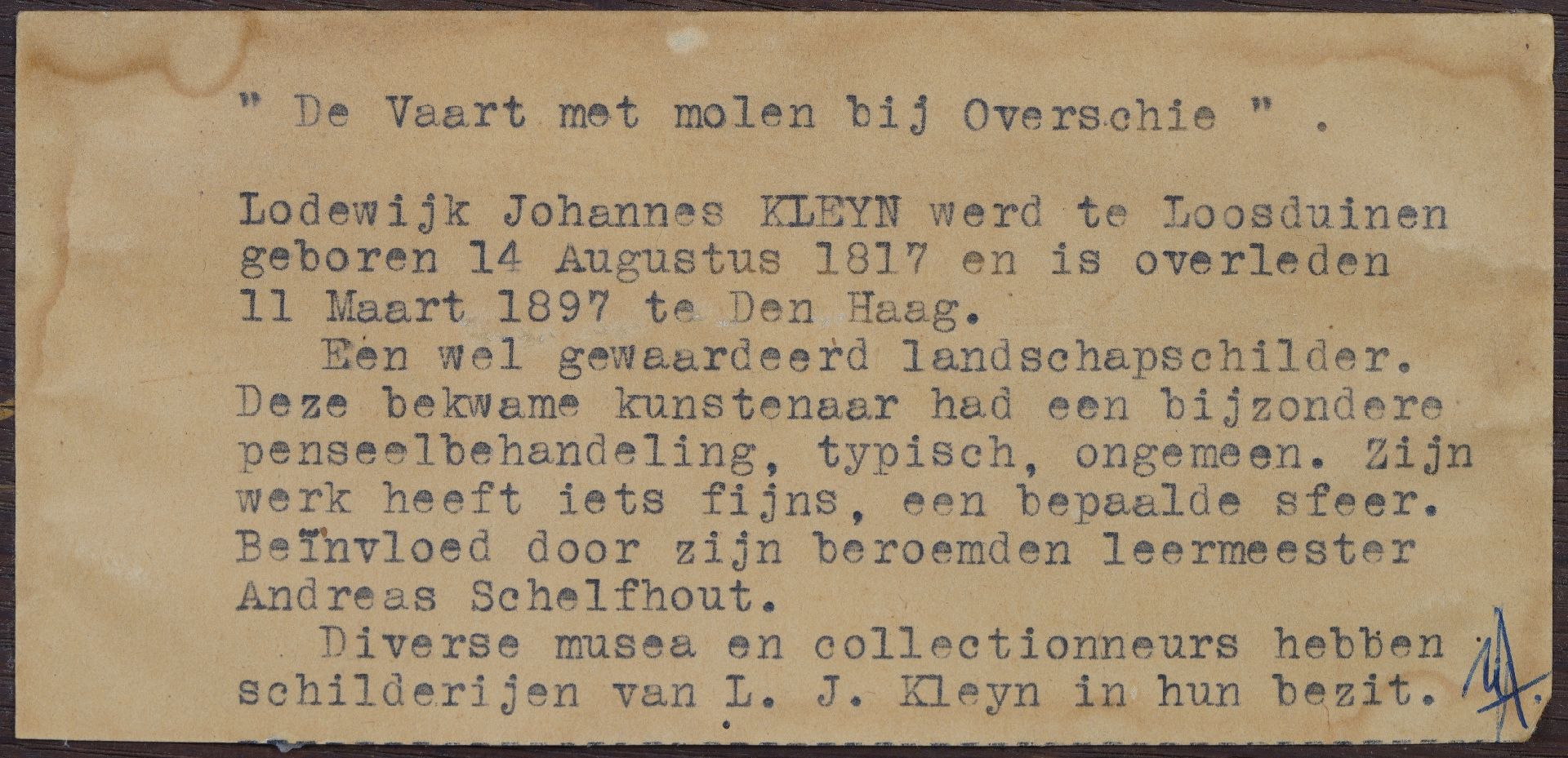 Als leerling van Andreas Schelfhout schilderde L.J. Kleijn veel winterlandschappen met schaatsende en sleeënde figuurtjes op spiegelend ijs. Daarnaast maakte hij zomerse rivier- en strandgezichten en panoramische landschappen, waarin hij de kalme sfeer en het warme licht van een zomerdag weet te treffen. Rond 1840 verbleef Kleijn enige tijd in het Duitse Kleef. Niet bekend is of hij daar naartoe ging voor B.C. Koekkoek: er zijn geen concrete aanwijzingen dat Kleijn les heeft gehad aan diens tekenacademie. Van Kleijns Kleefse periode getuigen een aantal schilderijen met stadsmotieven of de omgeving van Kleef als onderwerp. Vermoedelijk bereisde hij ook het Rijndal bij het Zevengebergte.