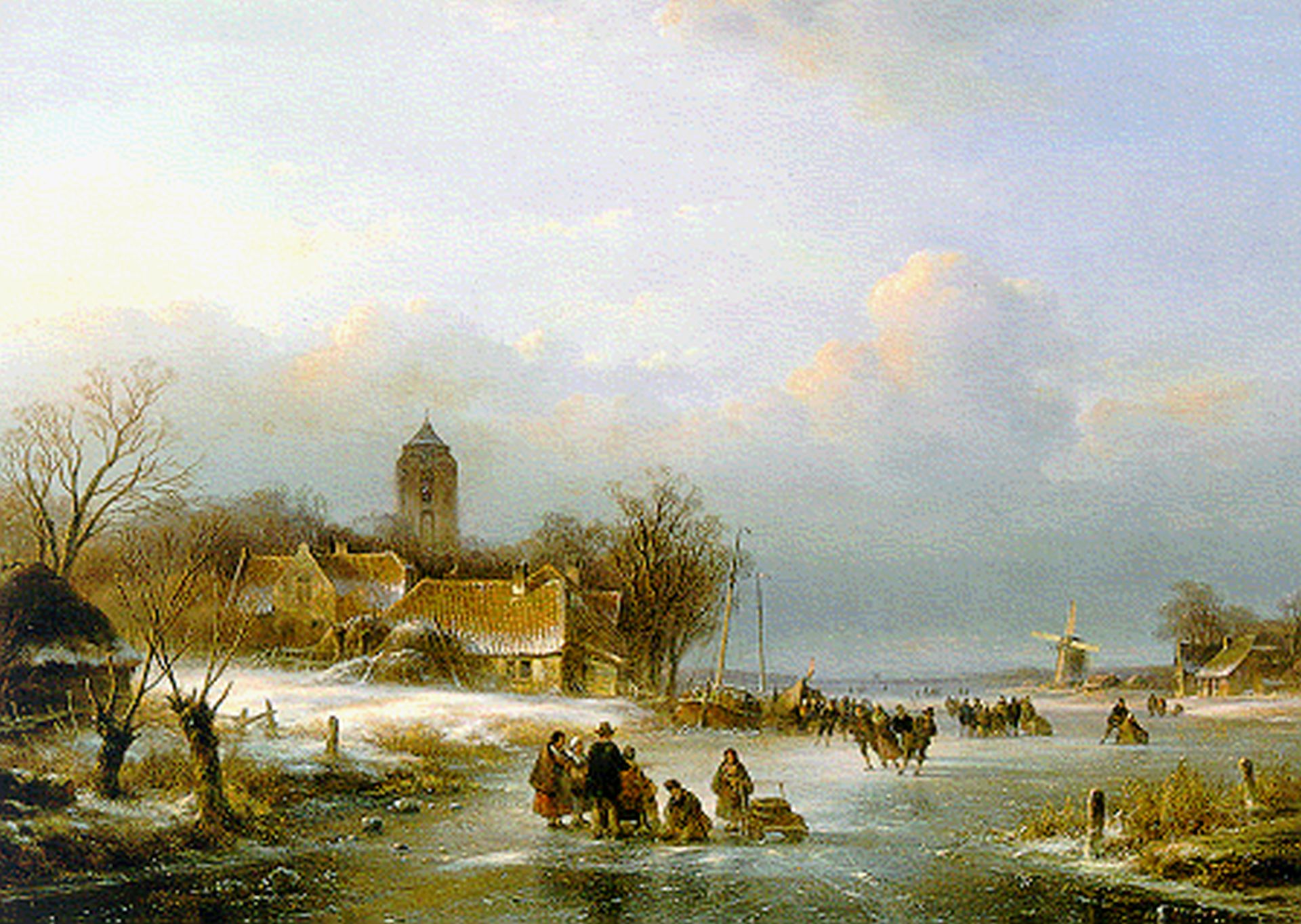 Lodewijk Johannes Kleijn kunstwerk • schilderij • voorheen te koop Schaatsers en koek-en-zopie op het ijs