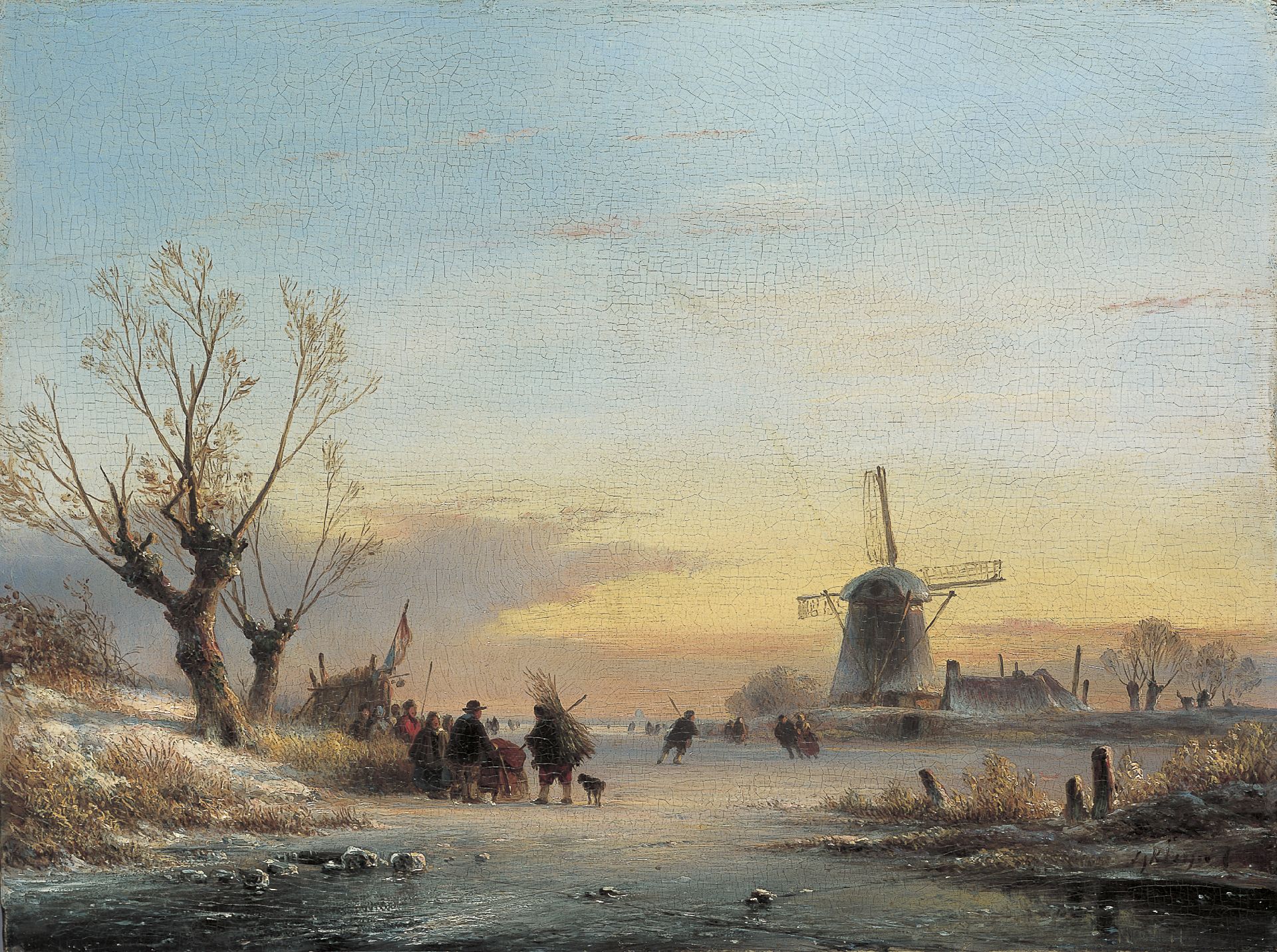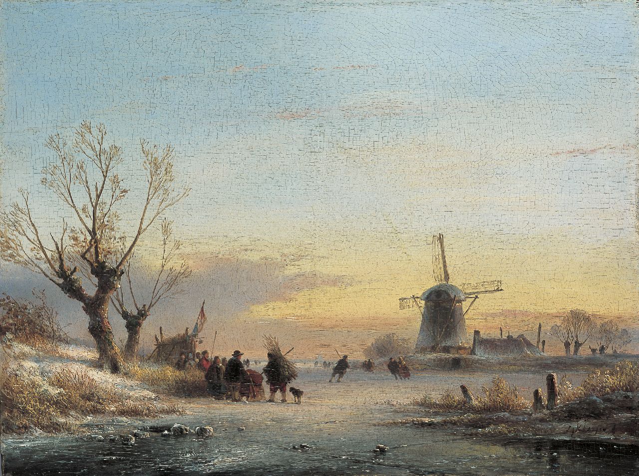 Lodewijk Johannes Kleijn kunstwerk • schilderij • voorheen te koop Schaatsers en wandelaars op het ijs bij een koek-en-zopie