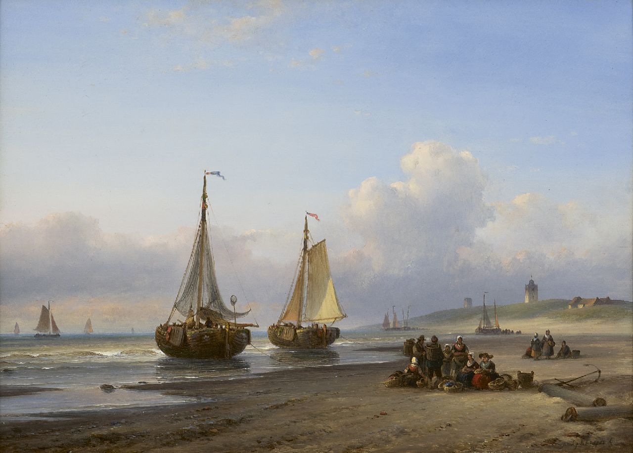 Lodewijk Johannes Kleijn kunstwerk • schilderij • voorheen te koop Vissersvolk en schuiten op het strand van Scheveningen