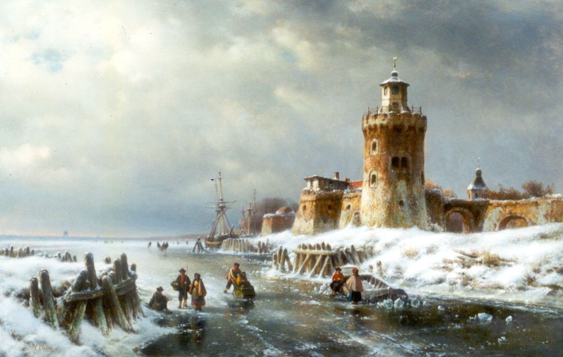 Lodewijk Johannes Kleijn kunstwerk • schilderij • voorheen te koop Wandelaars en schaatsers op het ijs bij een stadsmuur