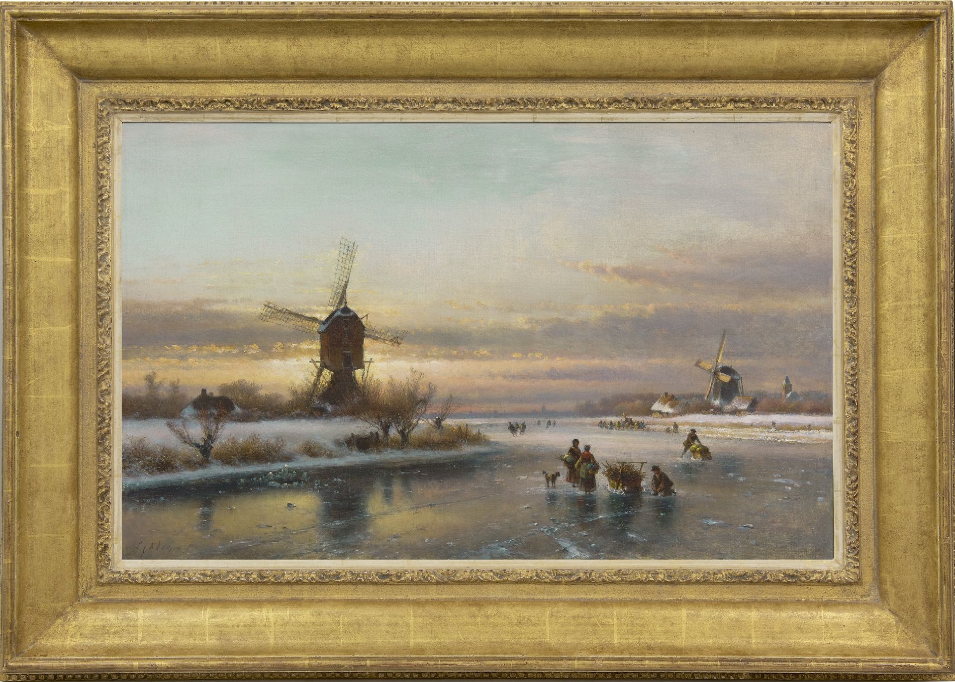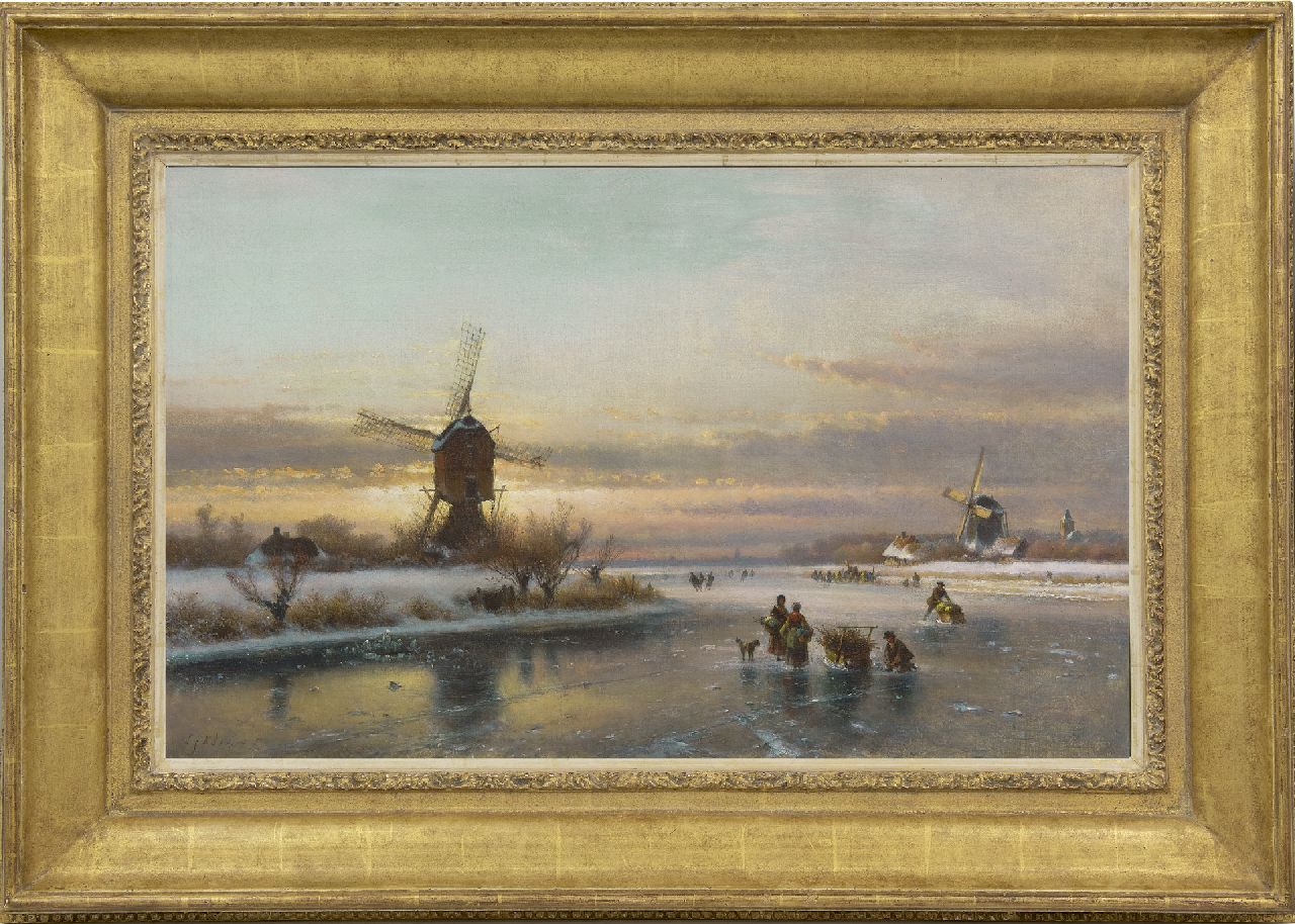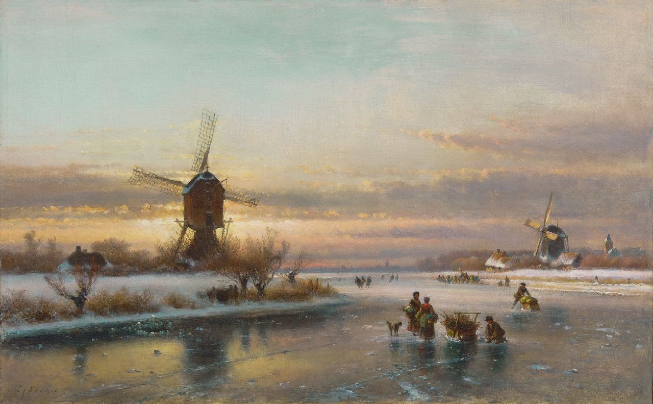 Lodewijk Johannes Kleijn kunstwerk • schilderij • voorheen te koop Winterlandschap met schaatsers bij een molen