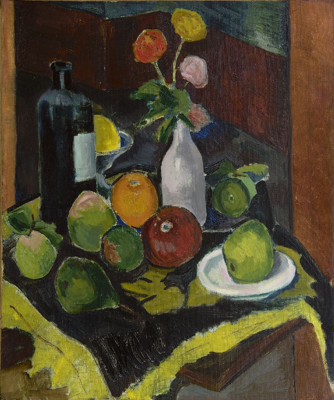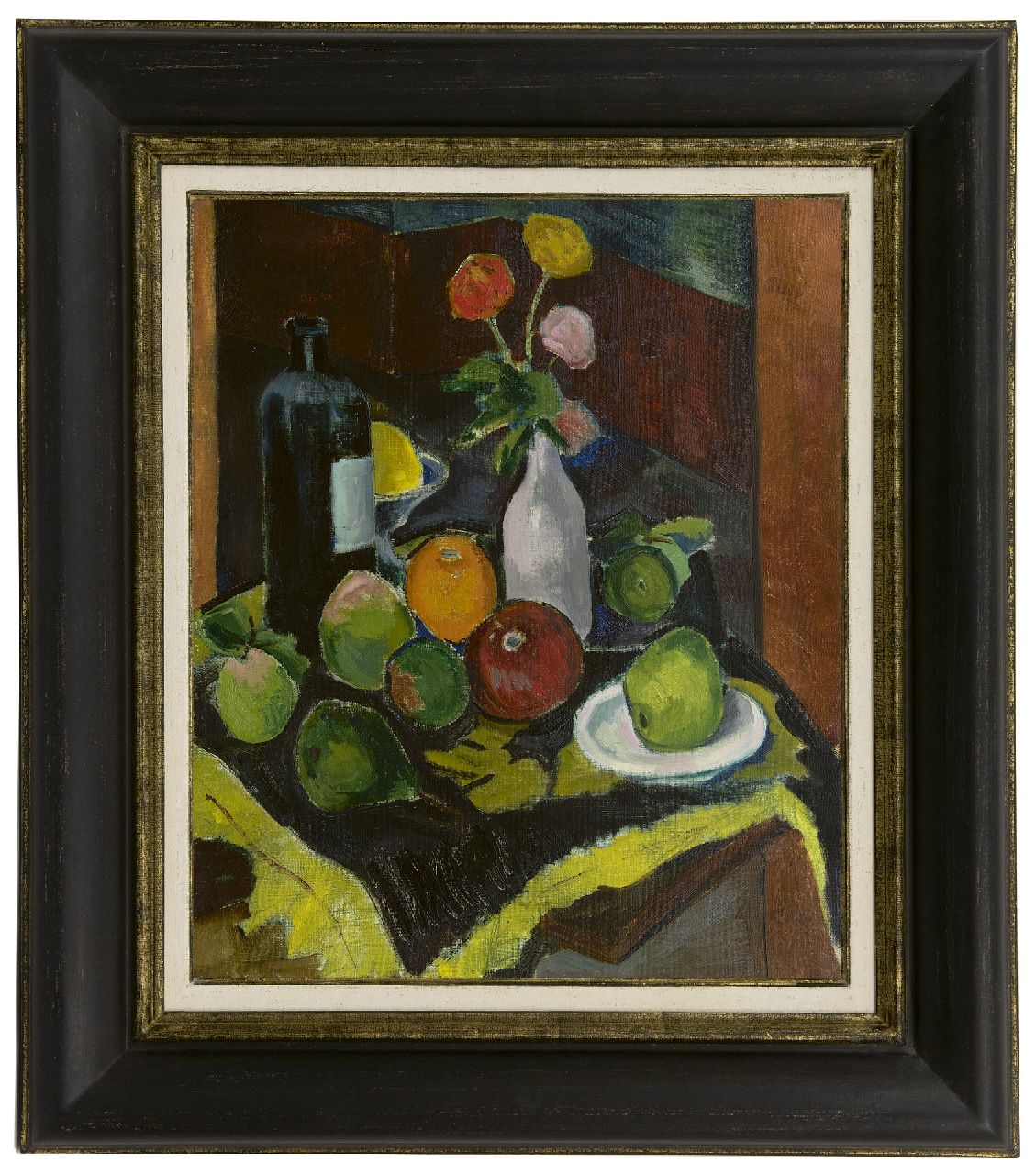 Lodewijk Schelfhout kunstwerk • schilderij • voorheen te koop Stilleven met fruit, bloemen en fles