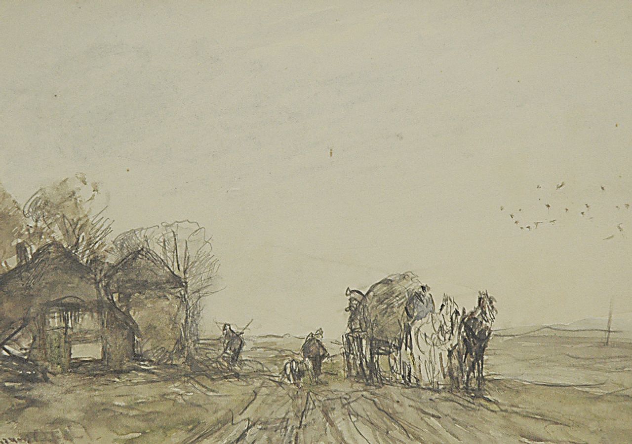 Louis Apol kunstwerk • aquarel • tekening • voorheen te koop Hooikar met paarden bij een boerenhuisje