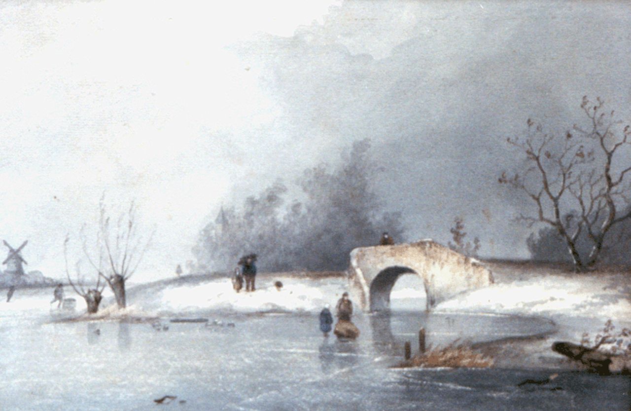 Louis Apol kunstwerk • aquarel • tekening • voorheen te koop IJsgezicht met figuren bij een brug