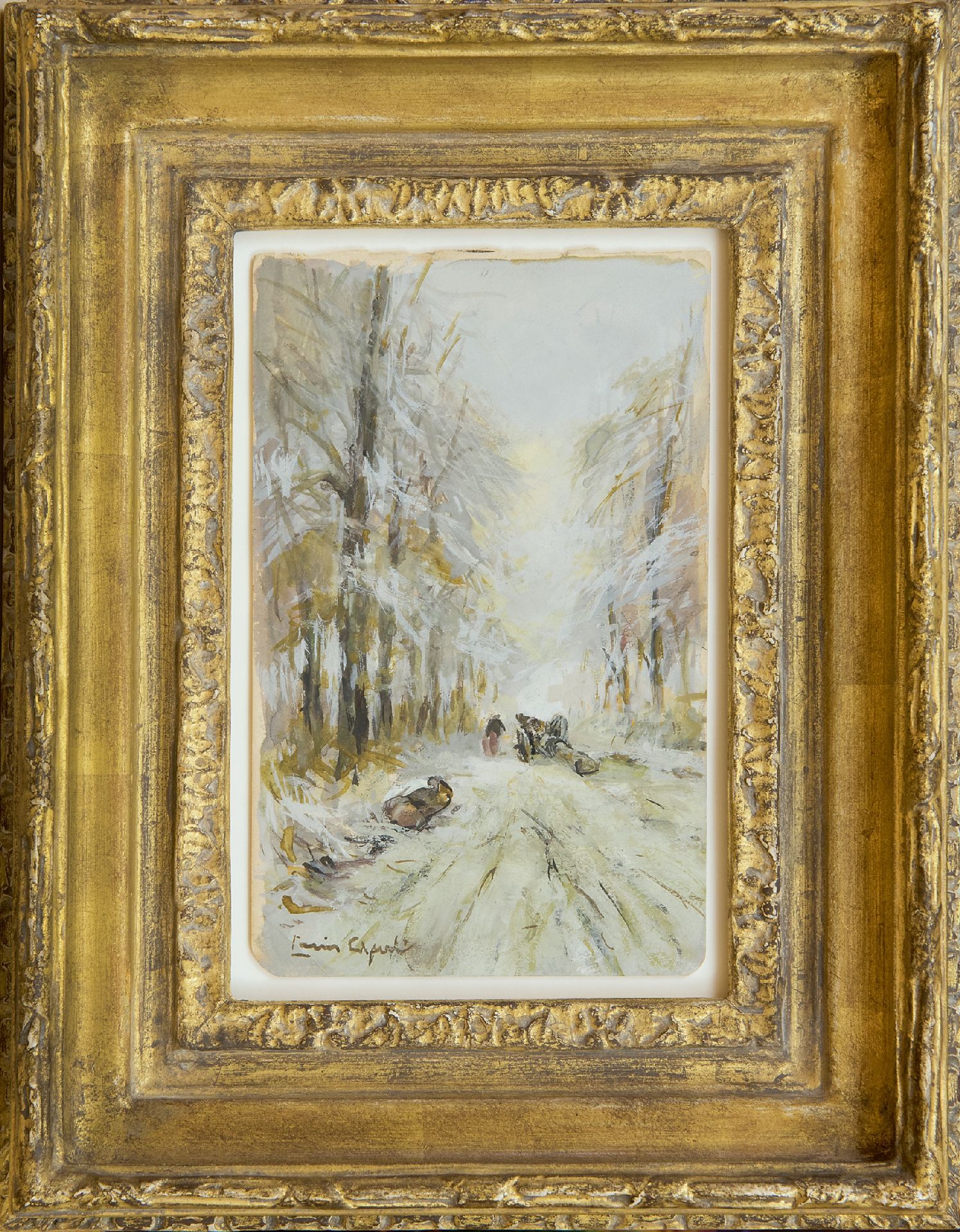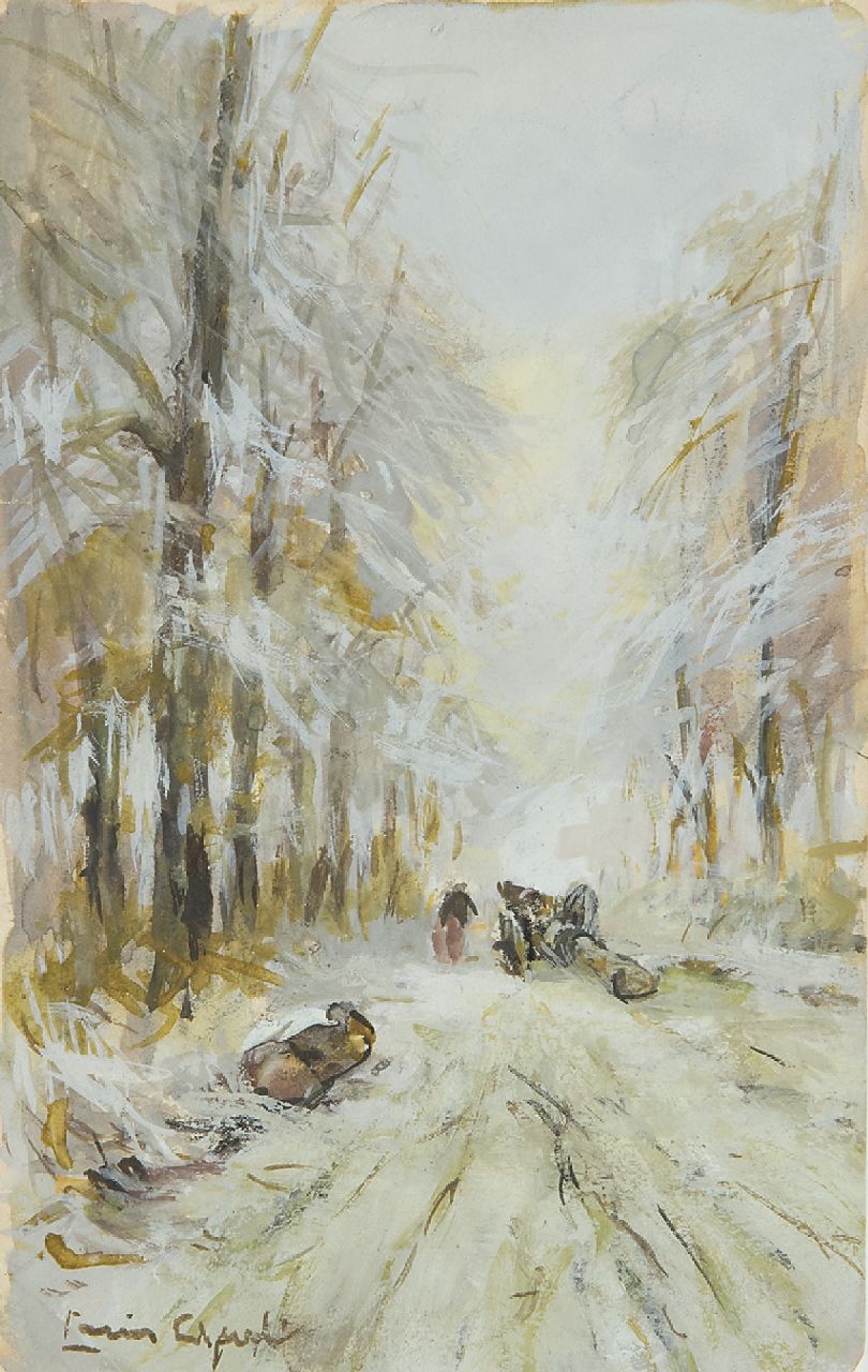 Louis Apol kunstwerk • aquarel • tekening • voorheen te koop Mallejan op een besneeuwd bospad