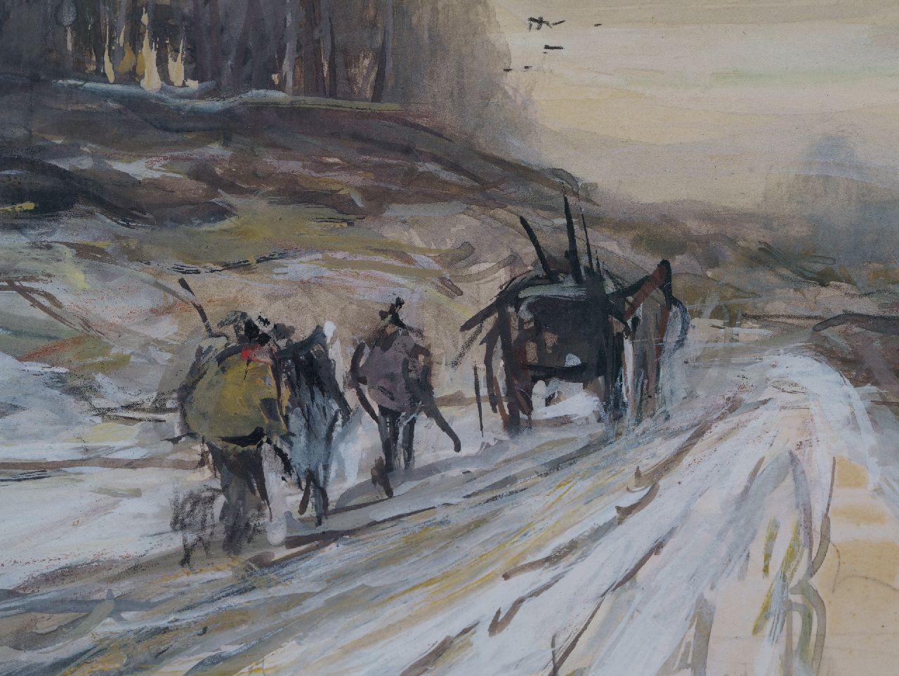 Louis Apol kunstwerk • aquarel • tekening • voorheen te koop Paard en wagen in een winterlandschap