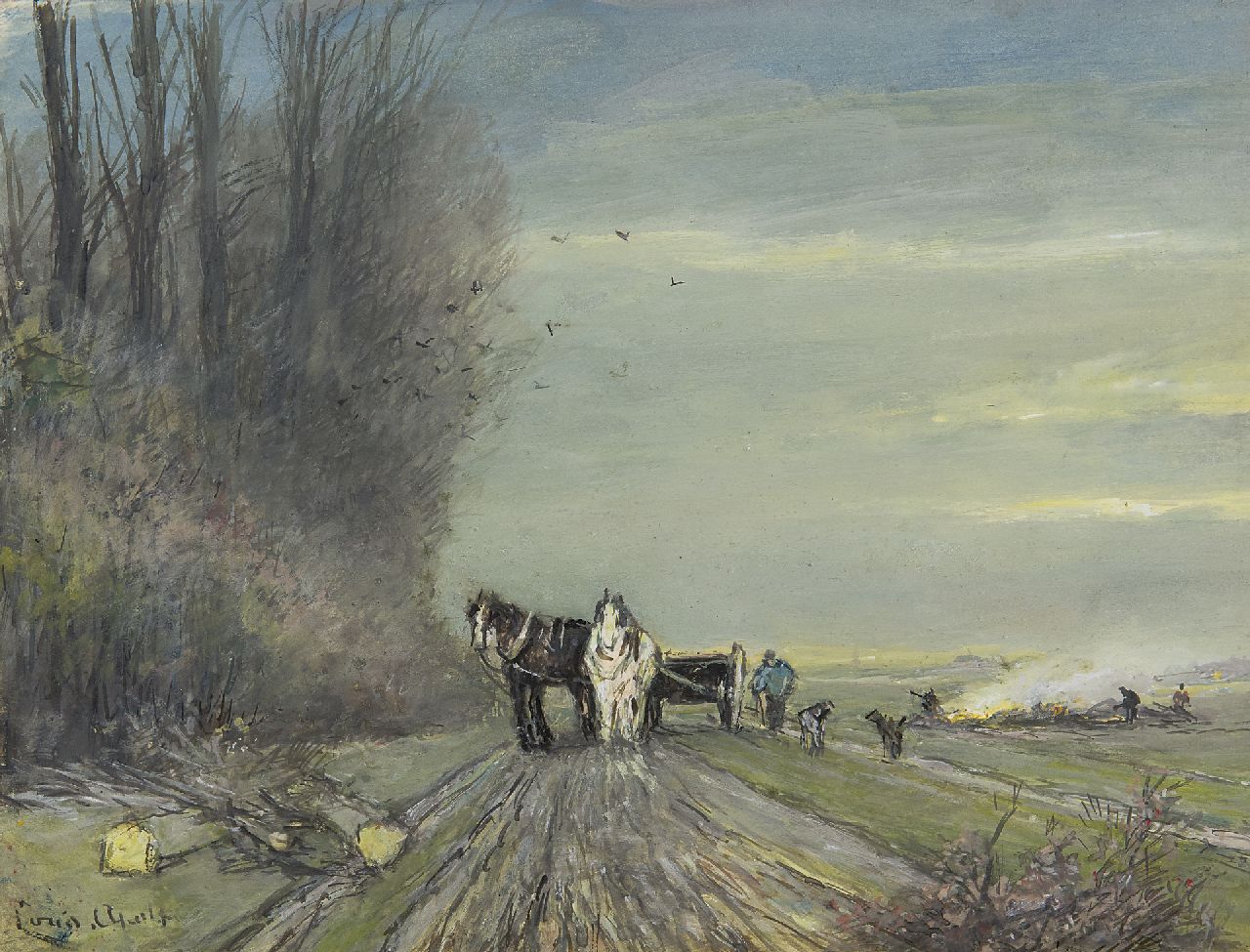 Louis Apol kunstwerk • aquarel • tekening • voorheen te koop Paardenkar op een landweg in de winter