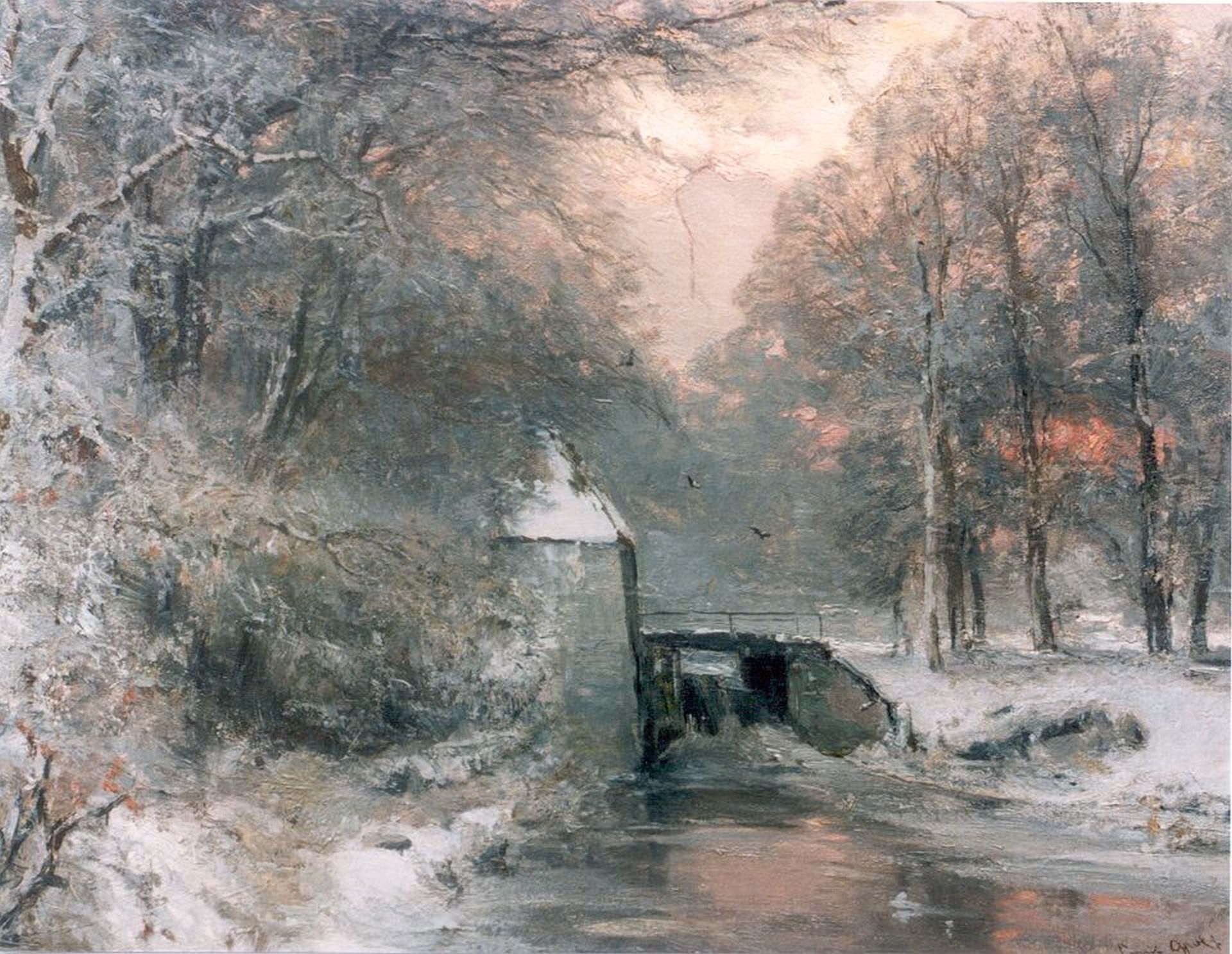 Louis Apol kunstwerk • schilderij • voorheen te koop Avondstemming in het besneeuwde bos