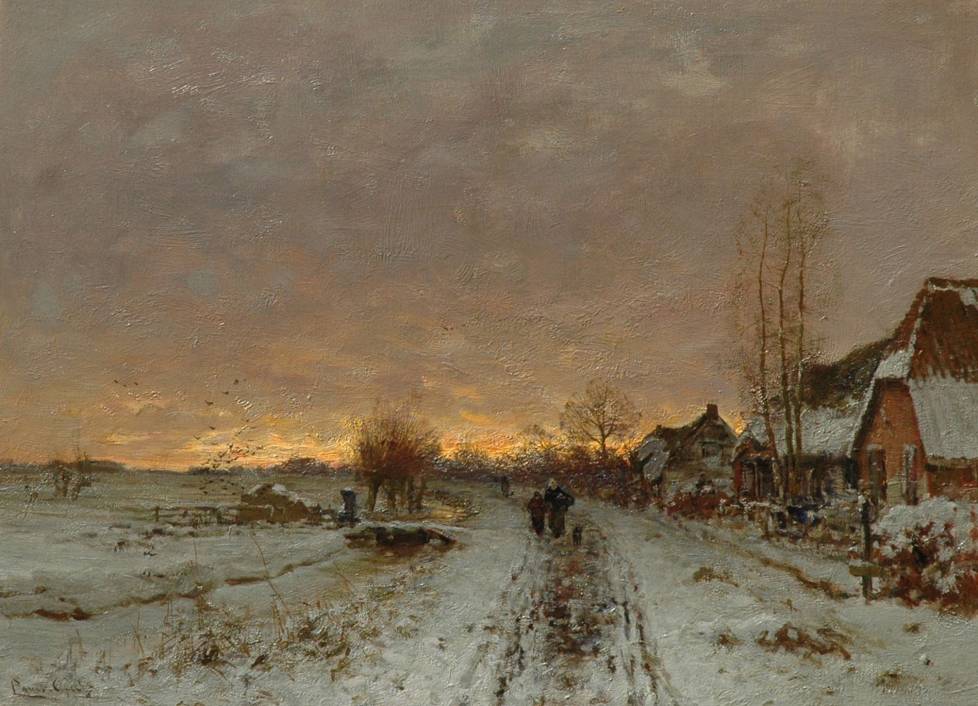 Louis Apol kunstwerk • schilderij • voorheen te koop Besneeuwd dorpspad bij ondergaande zon