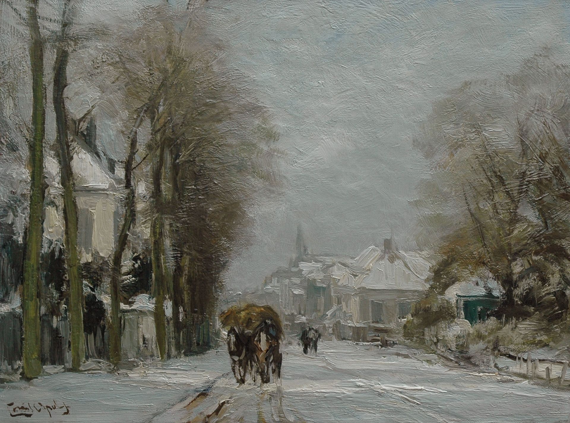 Louis Apol kunstwerk • schilderij • voorheen te koop Besneeuwde laan met paard-en-wagen