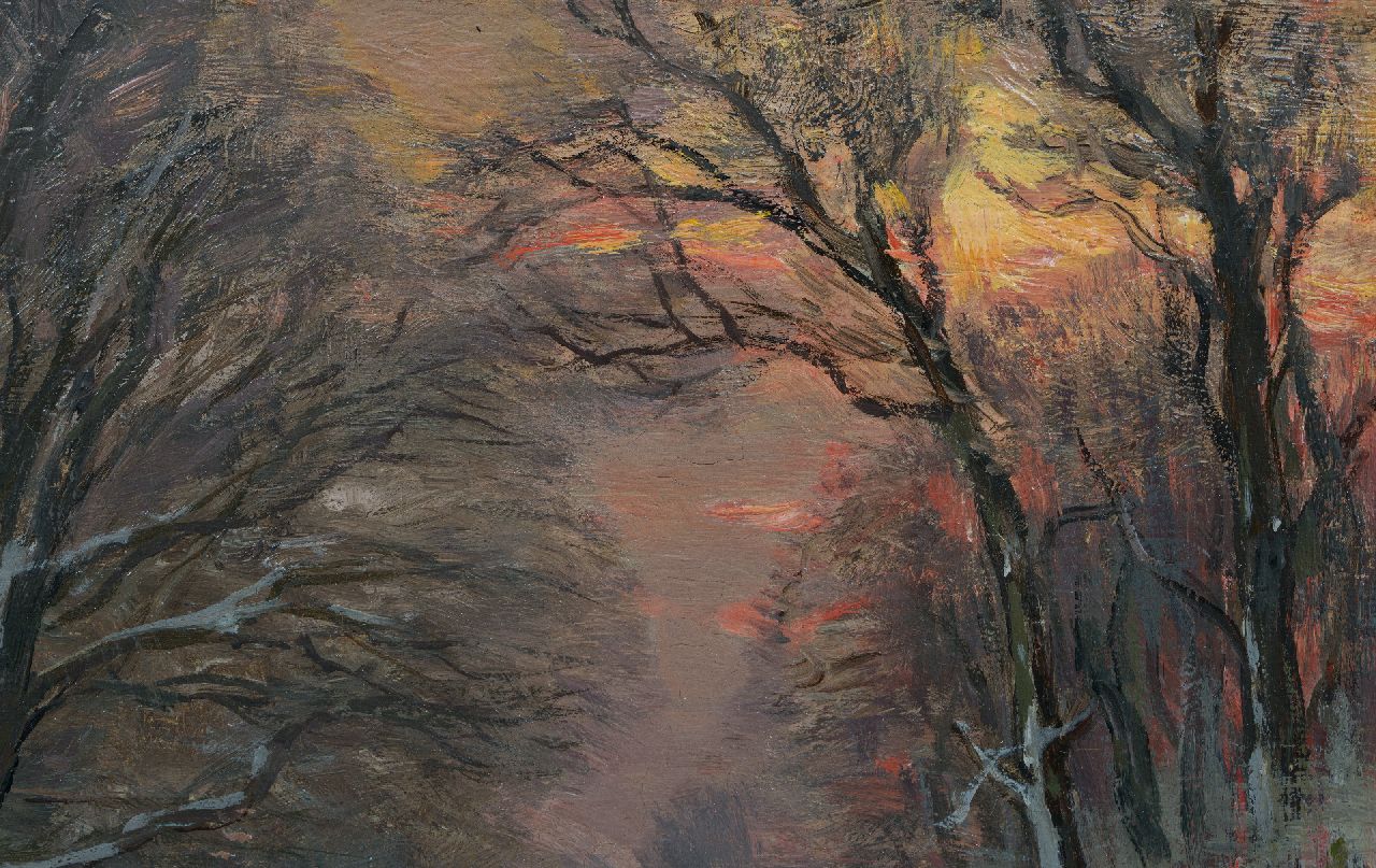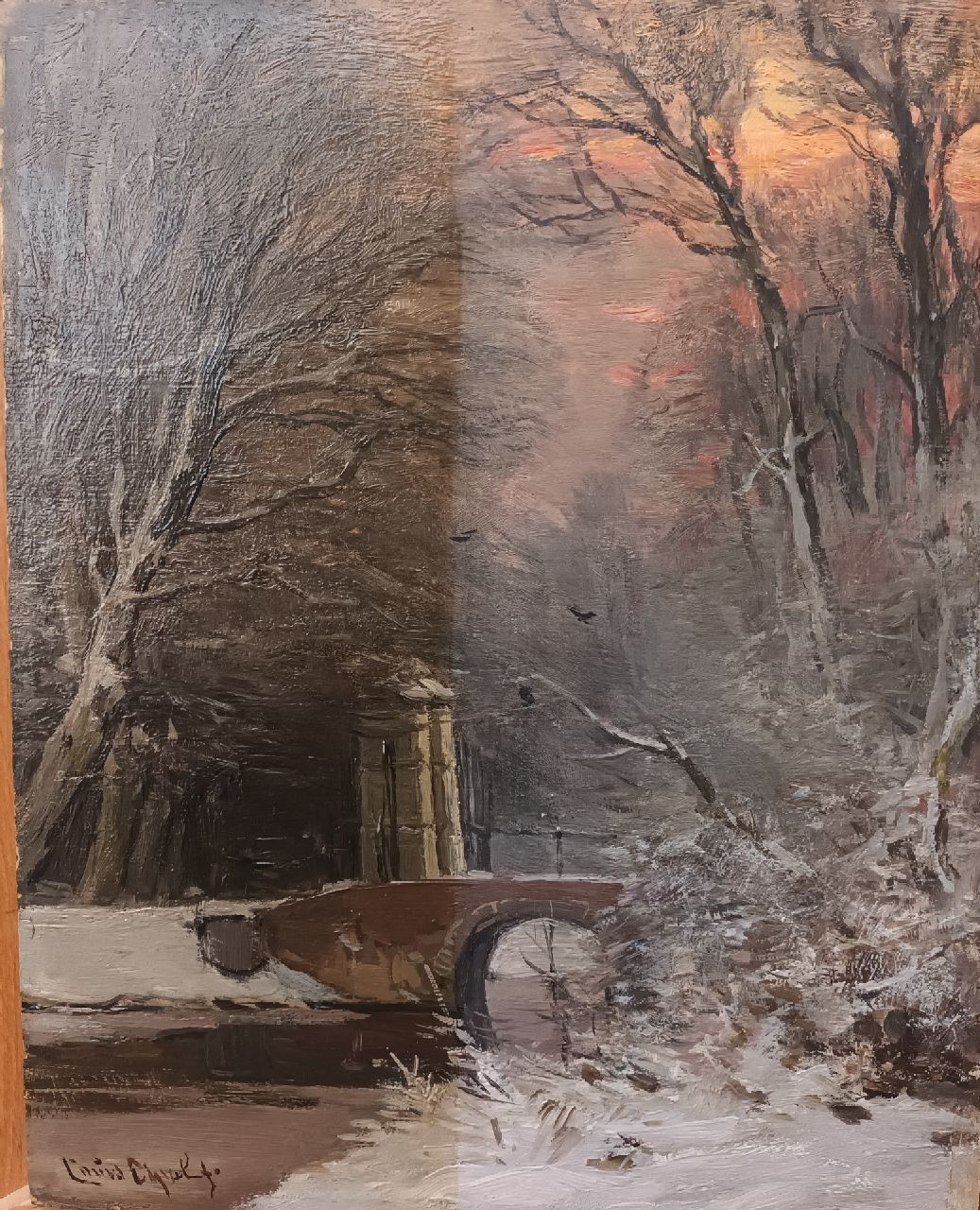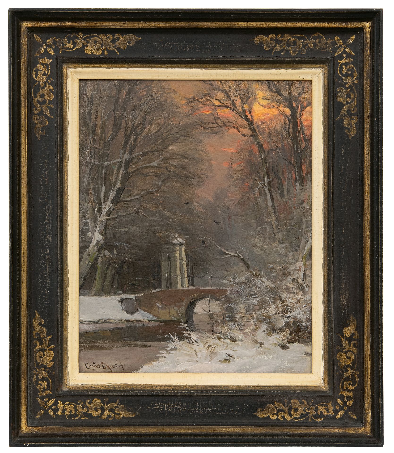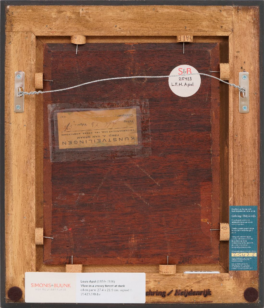 Louis Apol kunstwerk • schilderij • voorheen te koop Doorkijkje in besneeuwd bos bij schemering