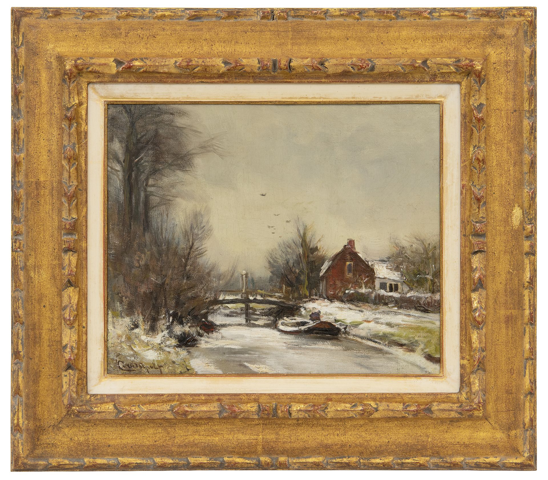 Louis Apol kunstwerk • schilderij • voorheen te koop Huis aan een vaartje in de sneeuw
