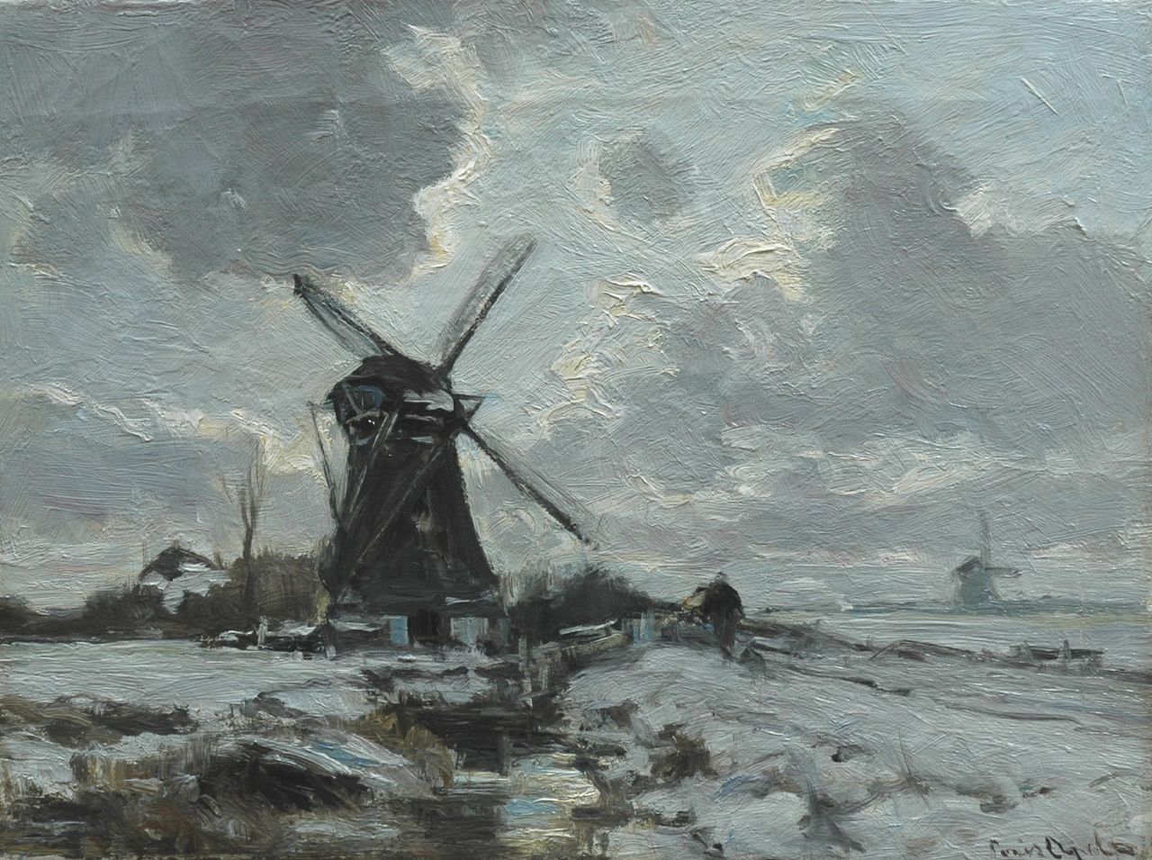 Louis Apol kunstwerk • schilderij • voorheen te koop Molen in een besneeuwd landschap
