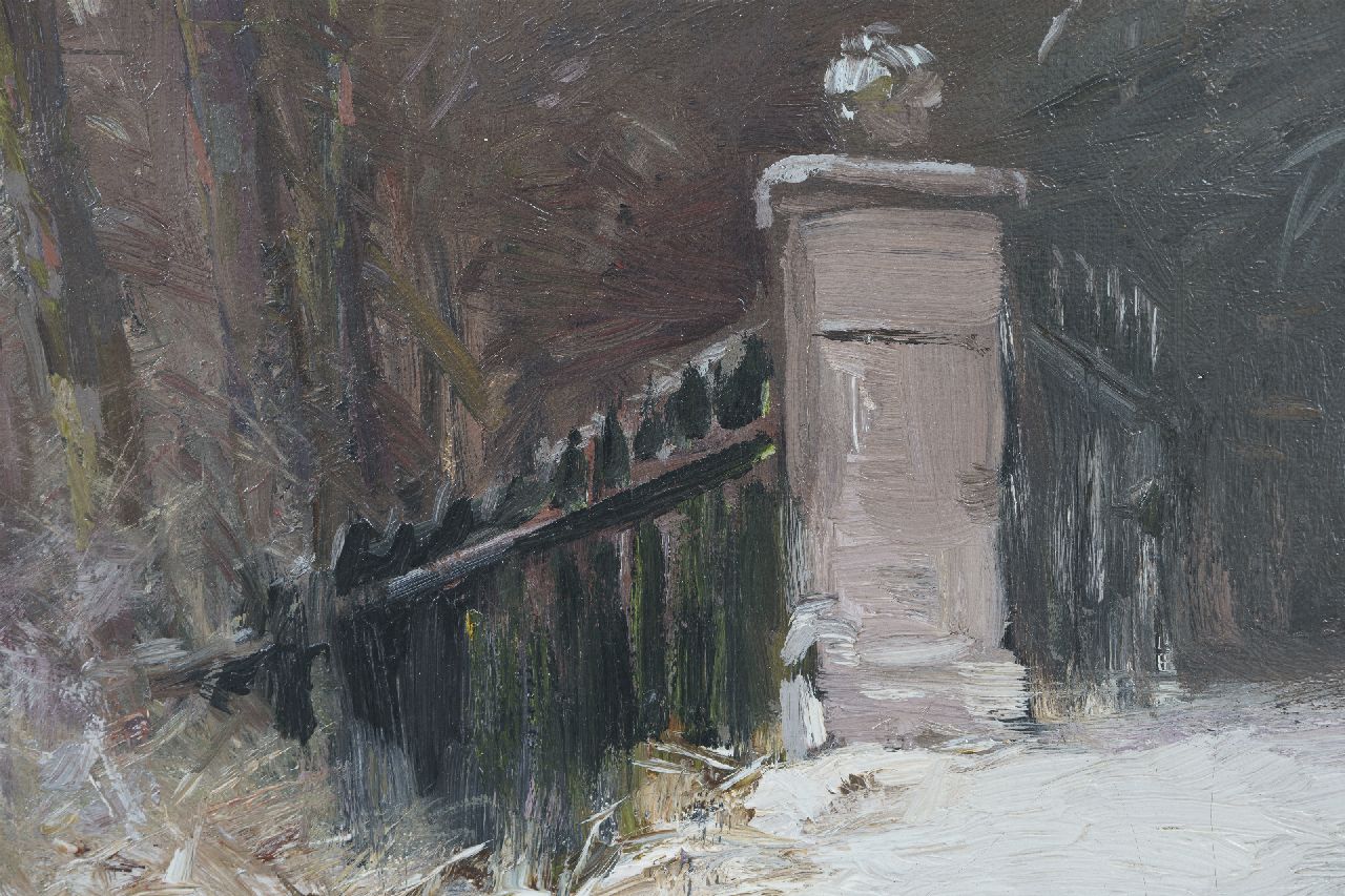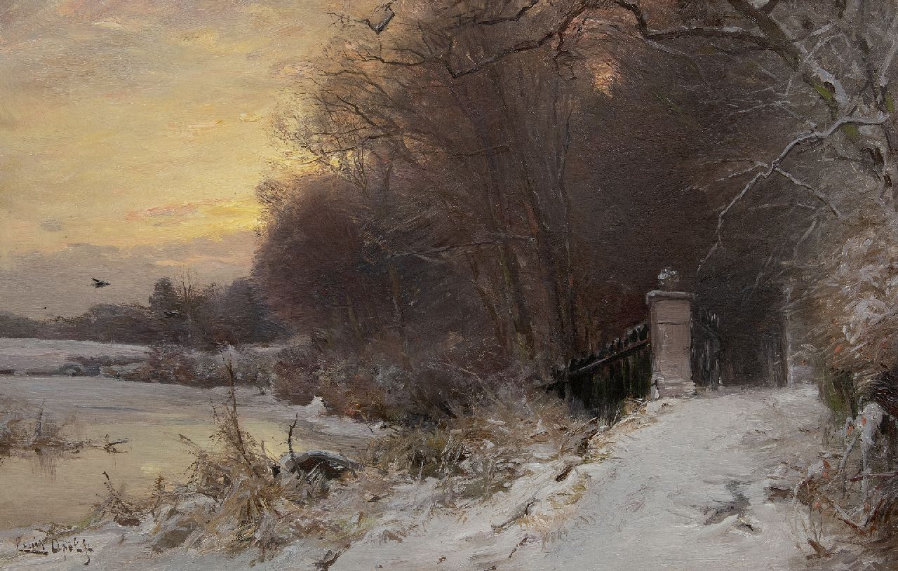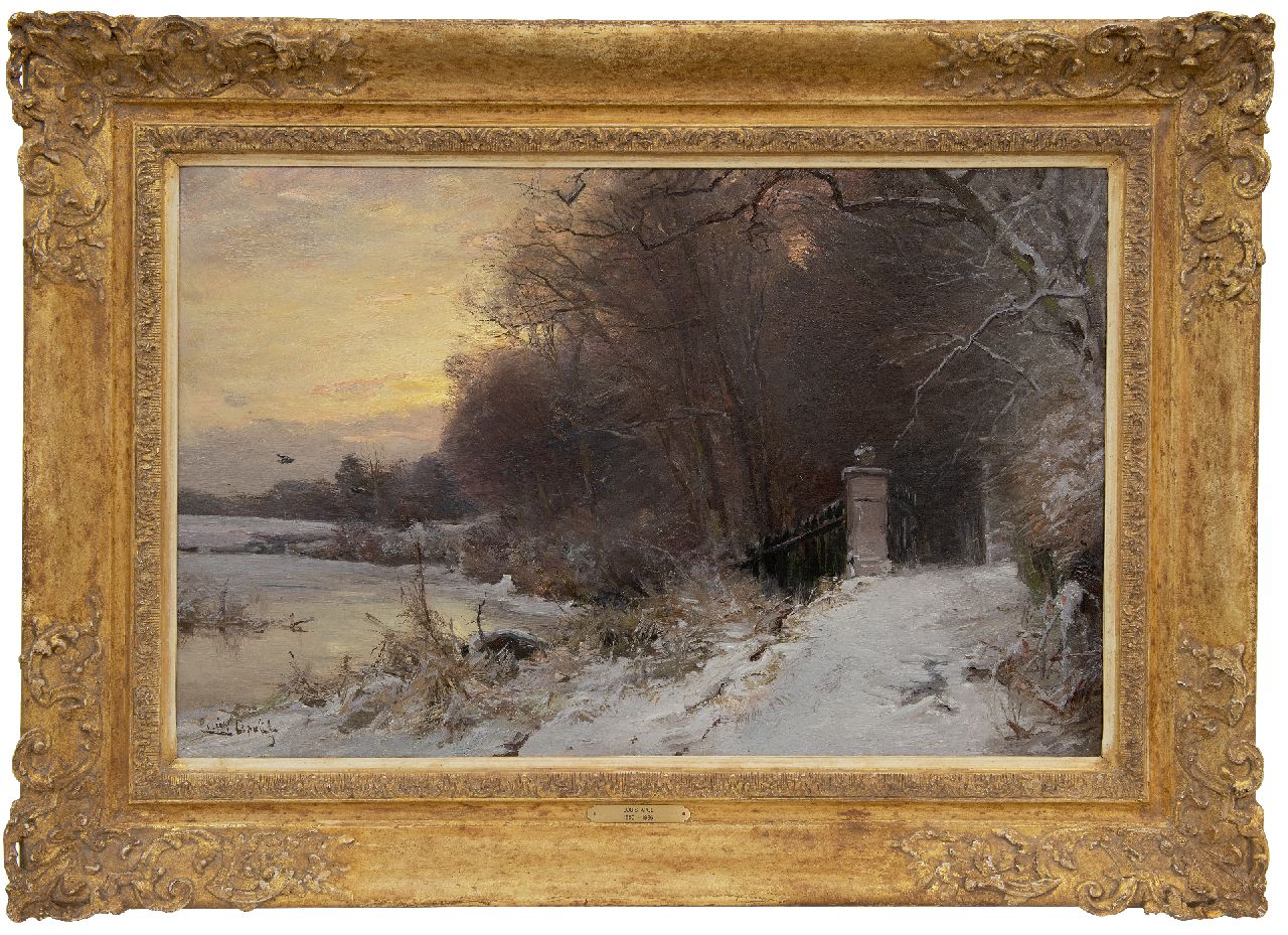 Louis Apol kunstwerk • schilderij • voorheen te koop Sneeuwlandschap bij een toegangspoort bij Haagse Bosch