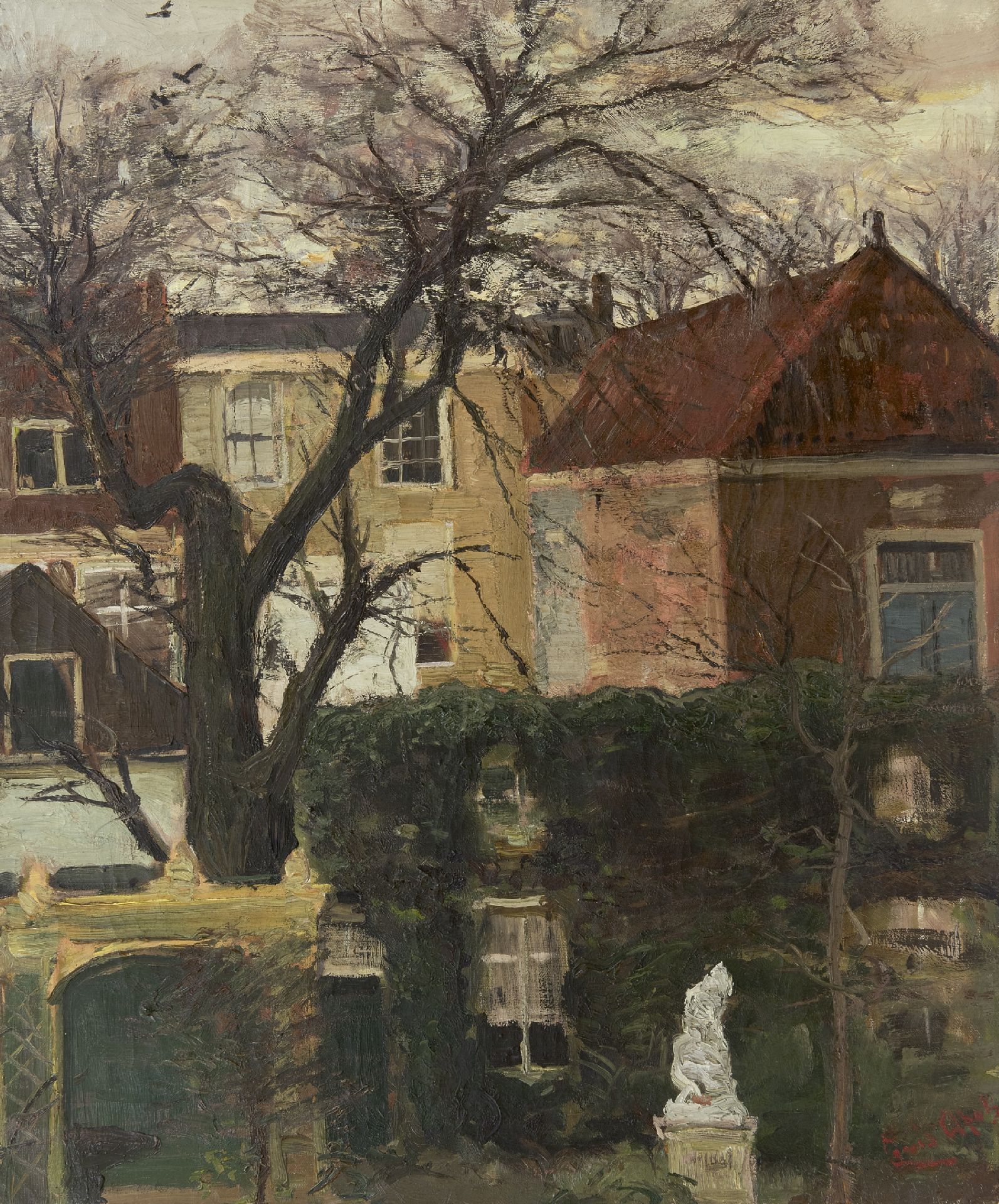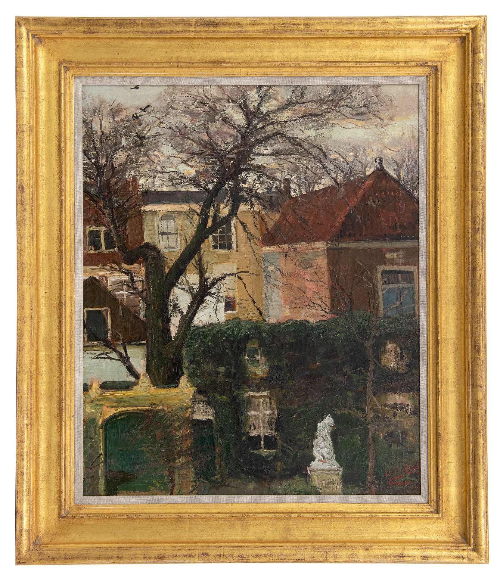 Louis Apol kunstwerk • schilderij • voorheen te koop Uitzicht over achtertuin en huizen, vermoedelijk de Juffrouw Idastraat, Den Haag