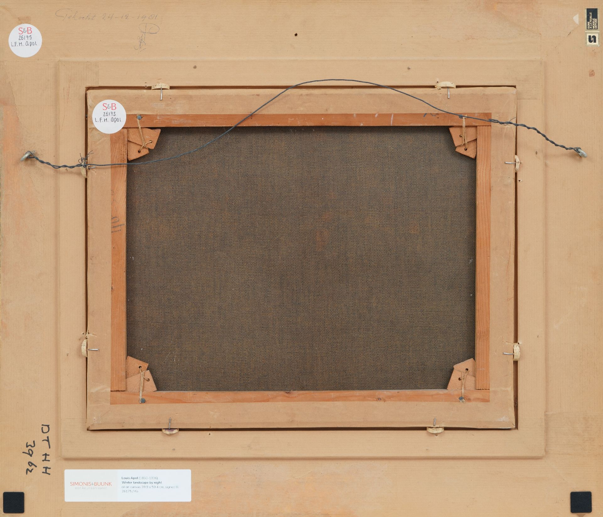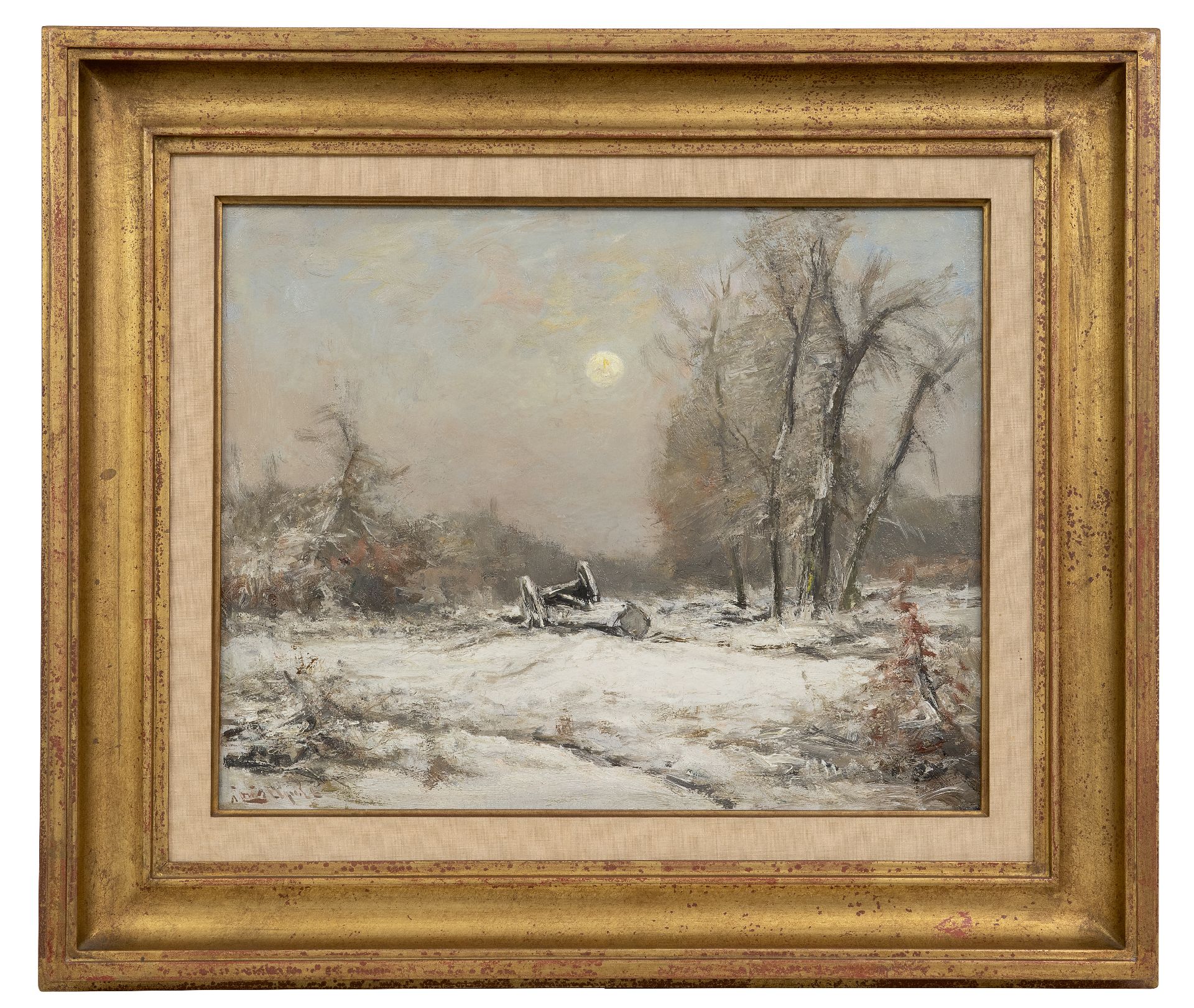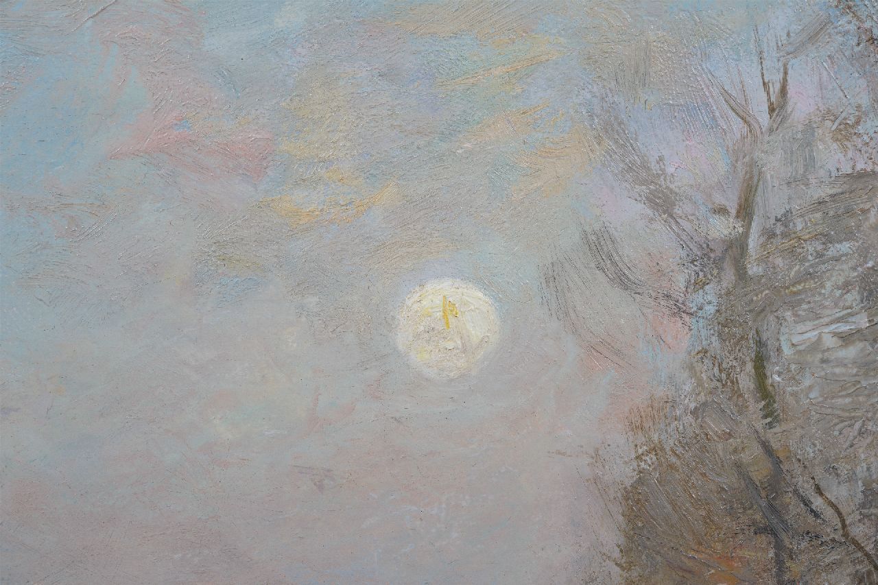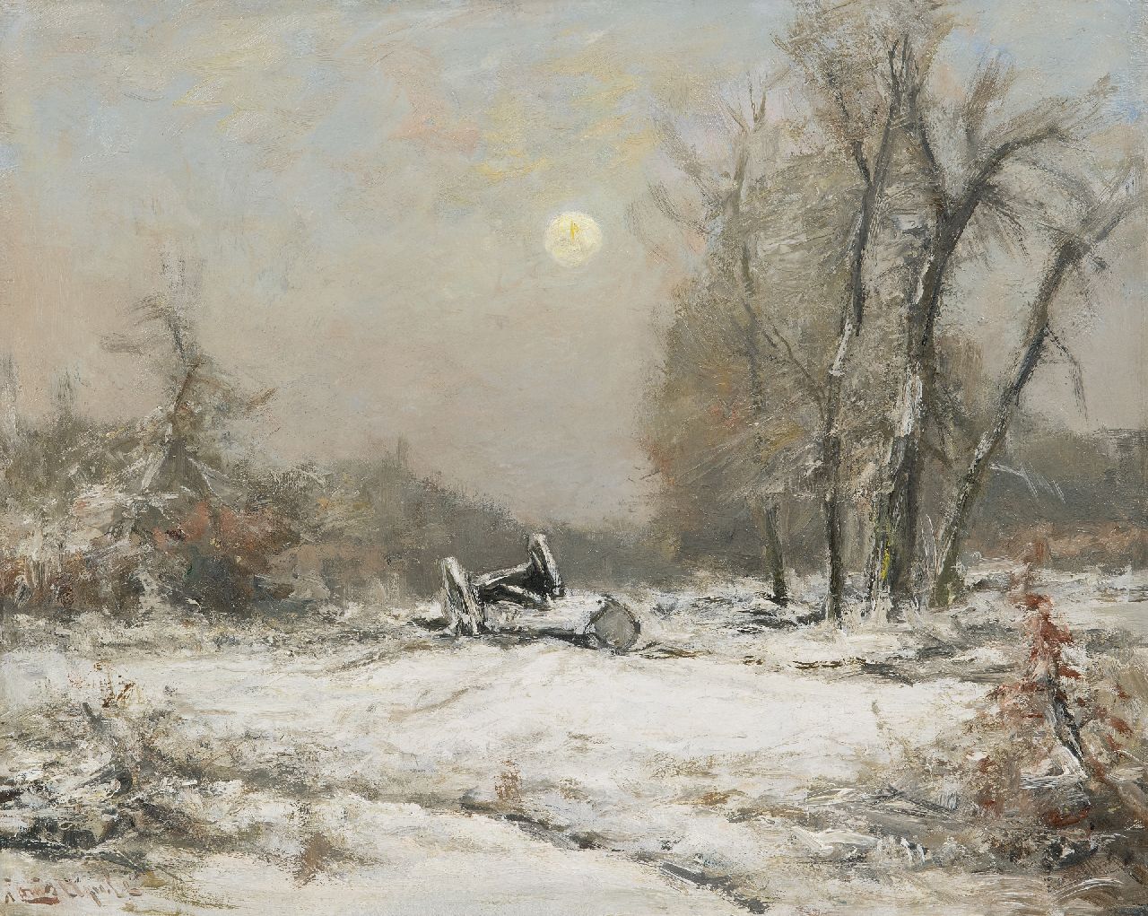 Louis Apol kunstwerk • schilderij • voorheen te koop Winterlandschap met mallejan bij avond
