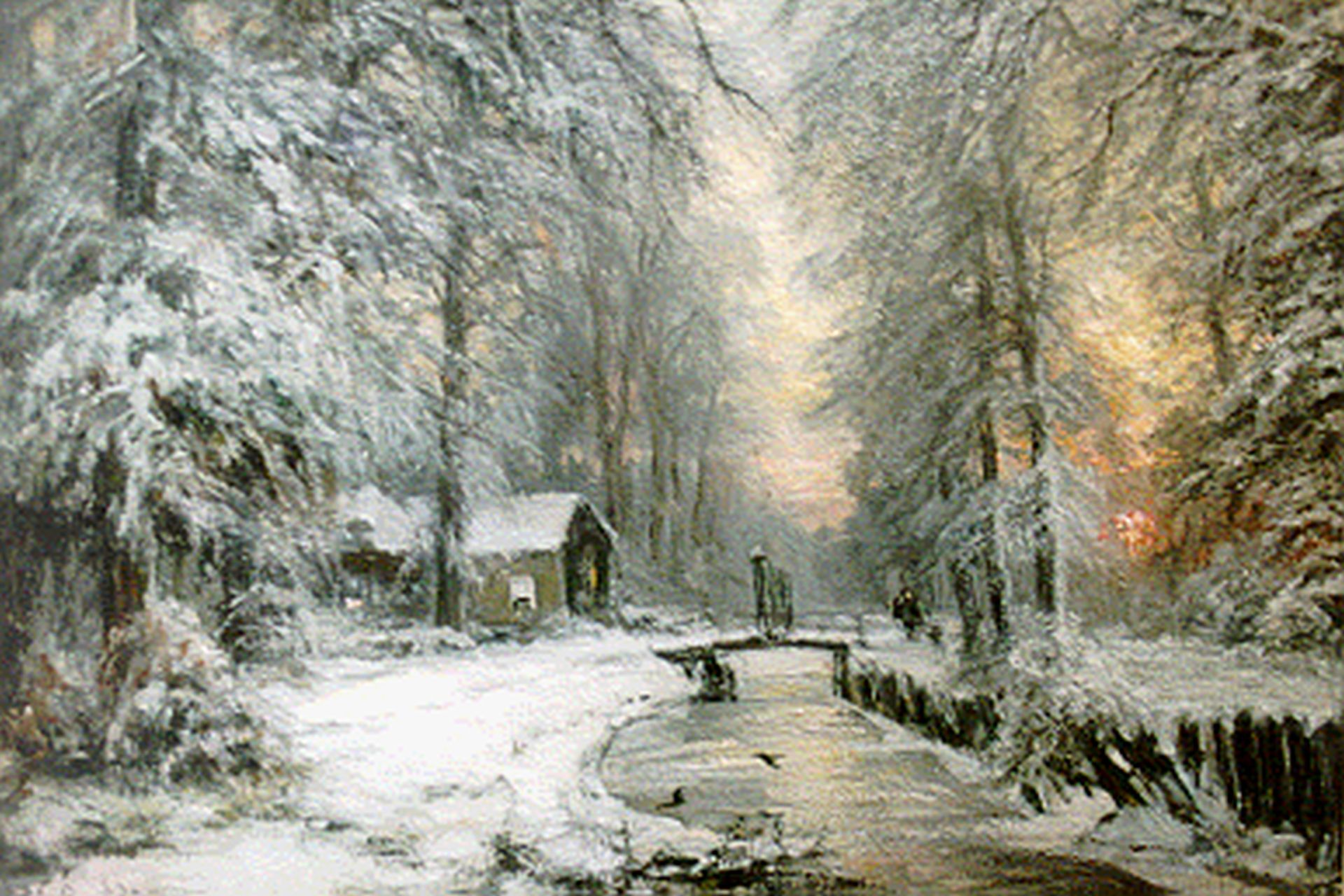 Louis Apol kunstwerk • schilderij • voorheen te koop Winters bos bij zonsondergang