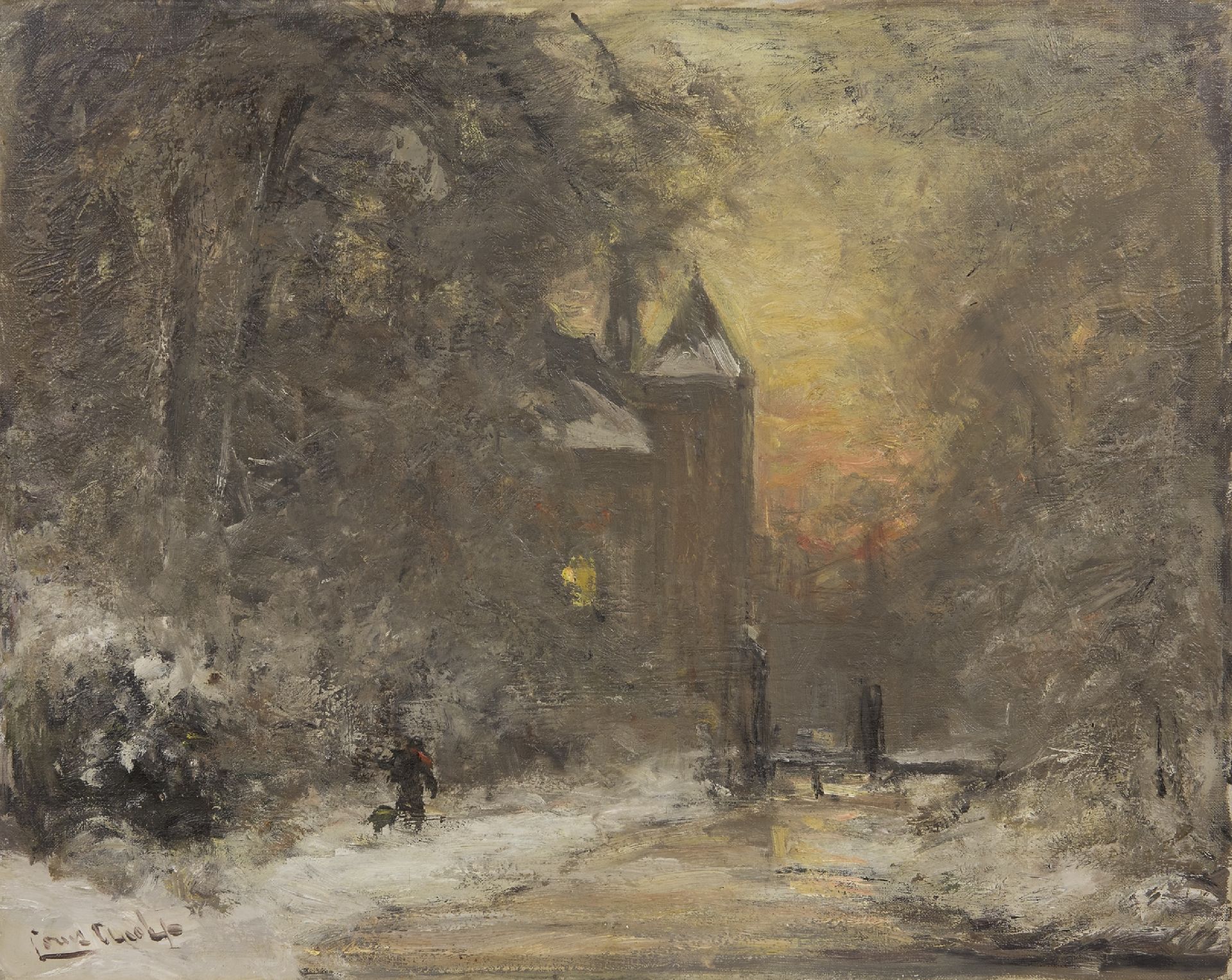 Louis Apol kunstwerk • schilderij • voorheen te koop Winters bosgezicht met een man met hond bij een kasteel
