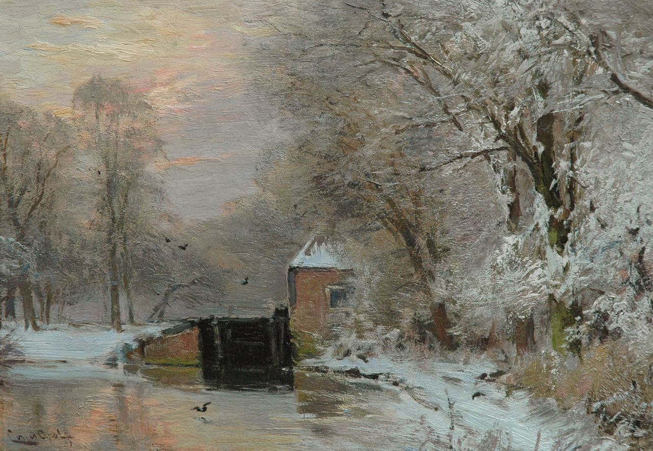 Louis Apol kunstwerk • schilderij • voorheen te koop Winters bosgezicht met sluisje, bij ondergaande zon