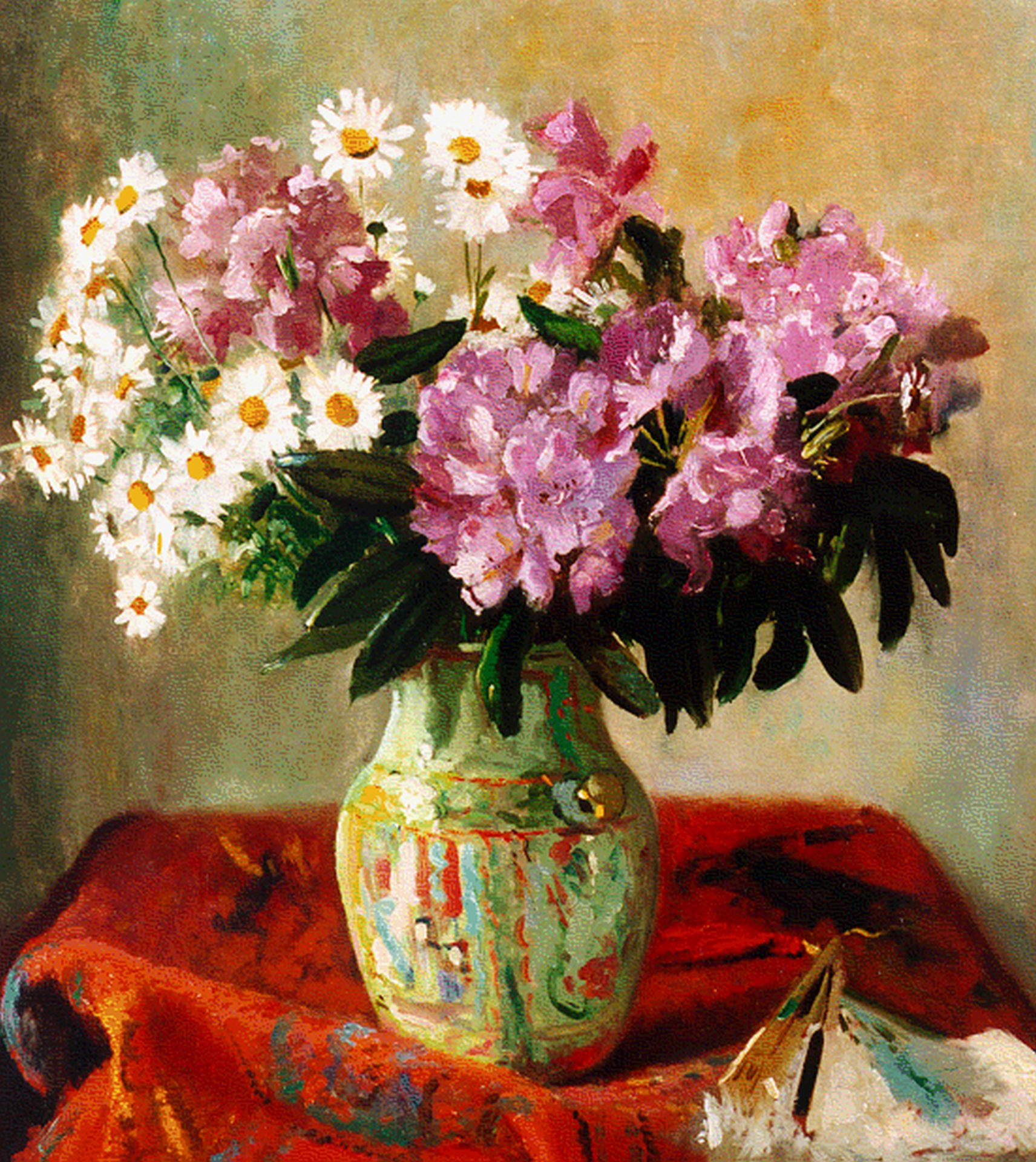 Louis de Winter kunstwerk • schilderij • voorheen te koop Rododendron en margrieten in een vaas