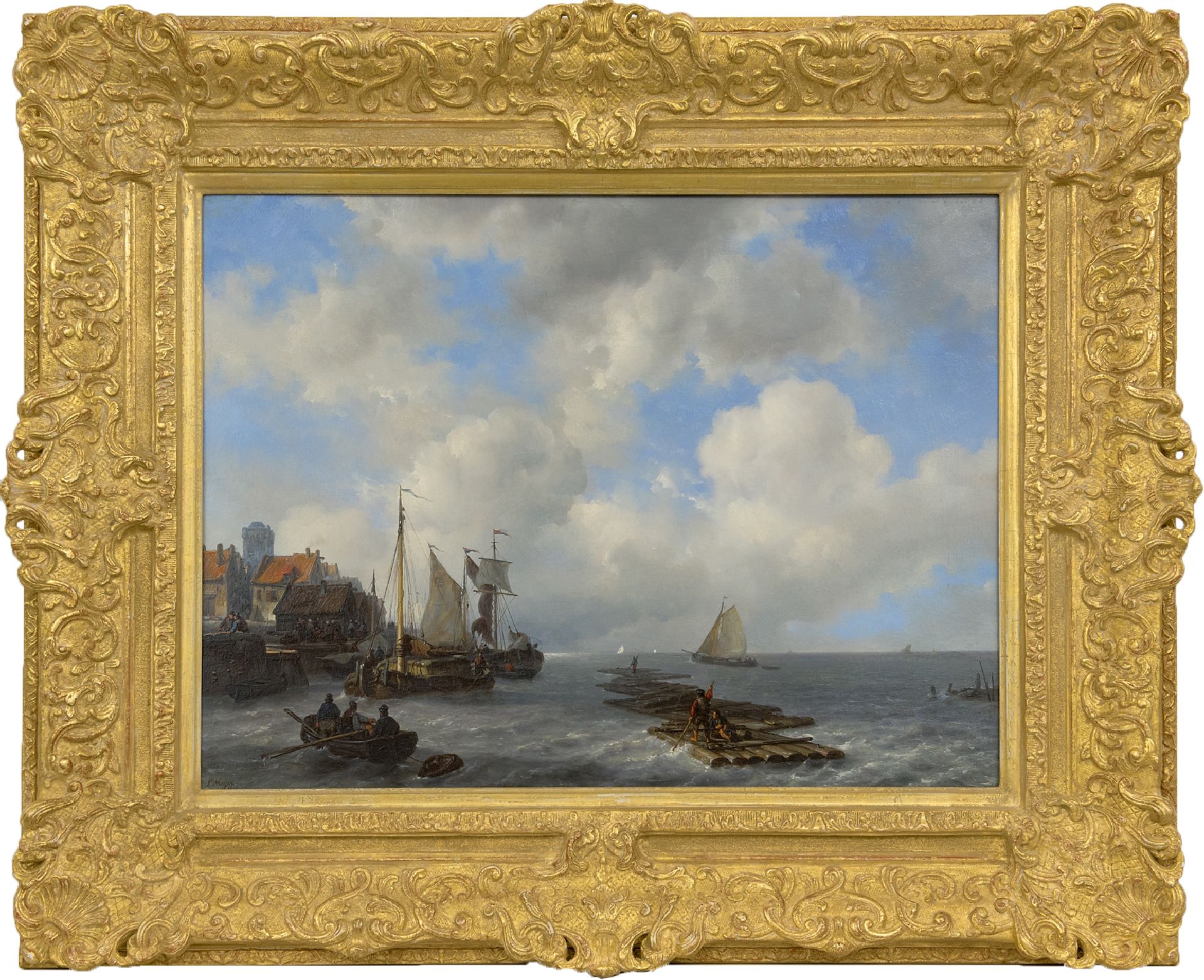 Louis Meijer kunstwerk • schilderij • te koop Bedrijvigheid van houttransporten aan een zeekade