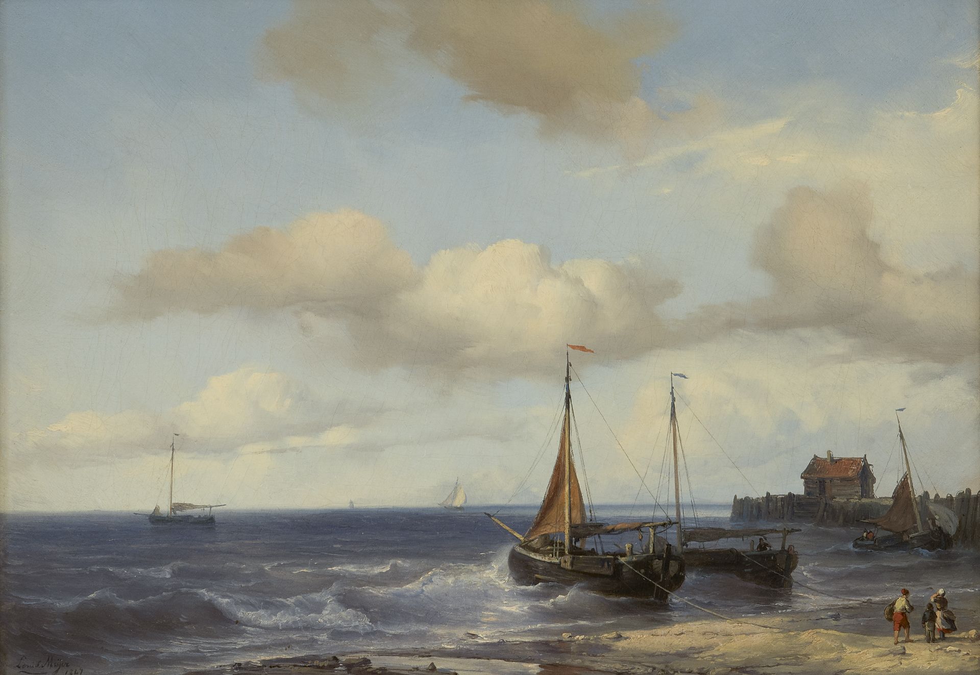In zijn jeugdperiode schilderde Louis Meijer bosgezichten, landschappen en ijsgezichten. Dat veranderde na een verblijf in Parijs van 1842 tot 1846 en een reis over de Middellandse Zee. Hij vestigde zich daarna in Den Haag en schilderde voortaan vrijwel alleen nog maar zeegezichten met schepen. Beroemd werd hij om zijn bijzonder knappe weergave van het transparante water en de reflectie van lucht en zon op de golven. Soms schilderde hij duidelijk Franse scheepstypen. Meijer had veel leerlingen en was een van de belangrijkste Hollandse marineschilders van de 19e eeuw.