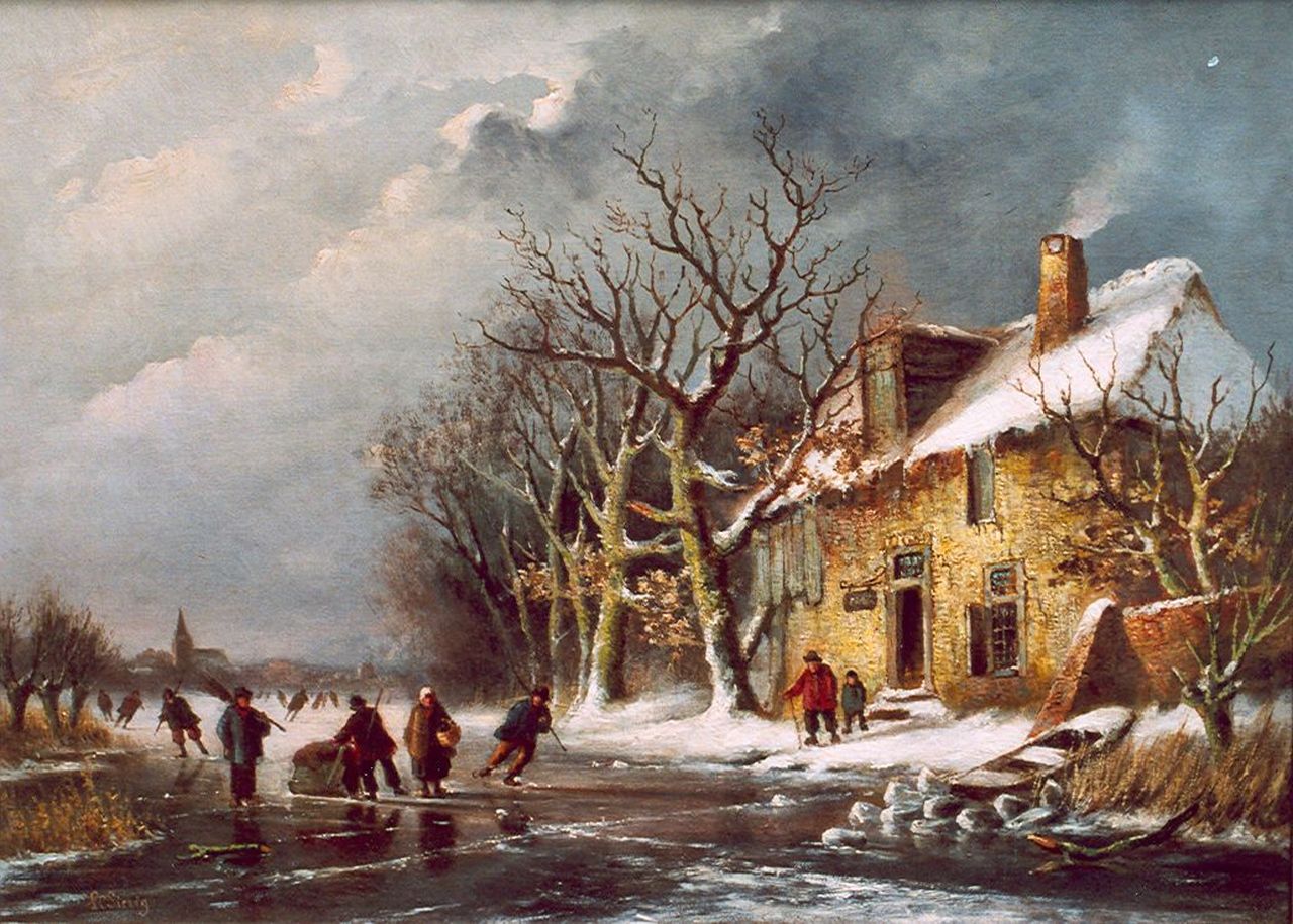 Louis Sierich kunstwerk • schilderij • voorheen te koop Rivierlandschap met schaatsers bij een herberg