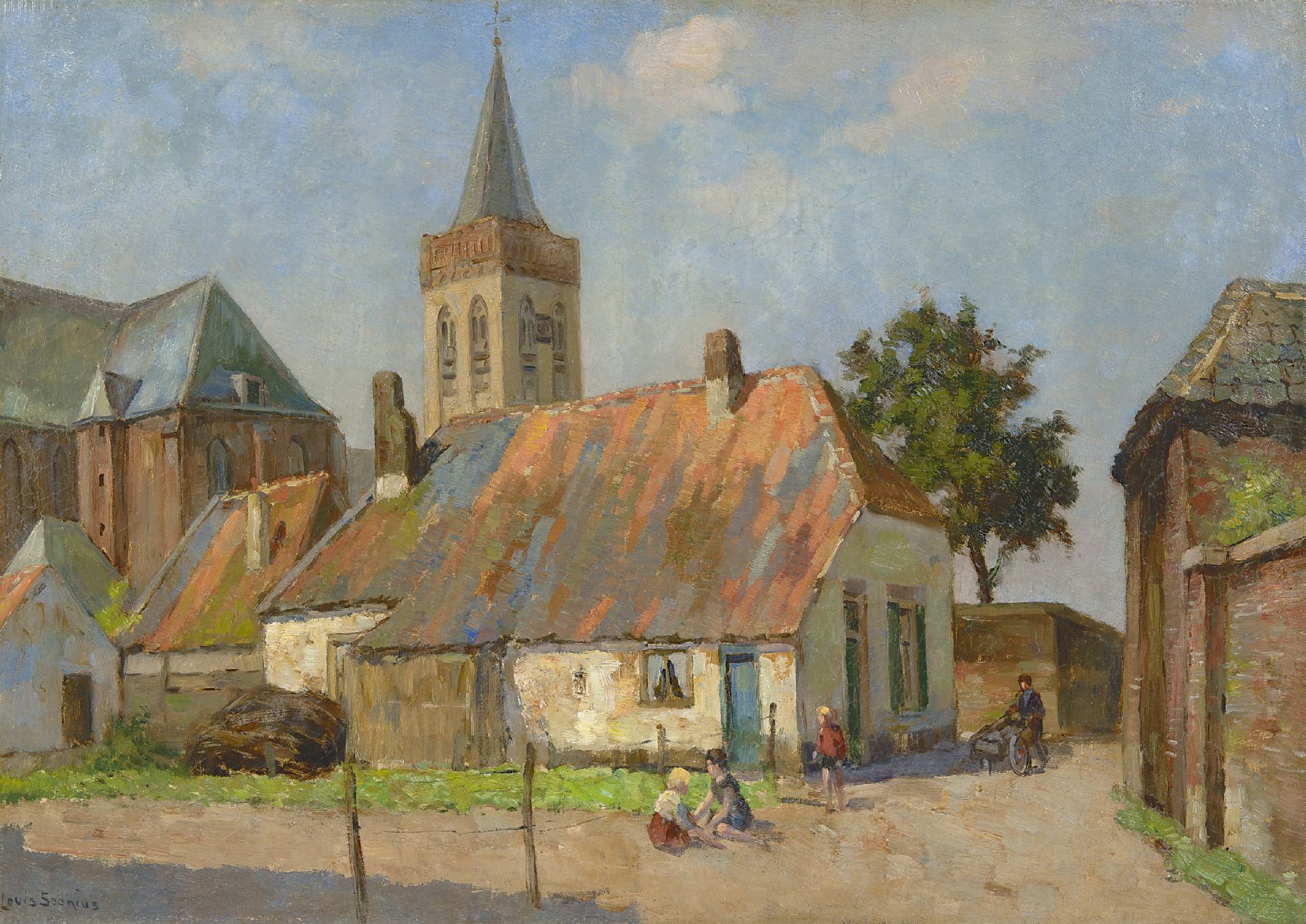 Louis Soonius kunstwerk • schilderij • voorheen te koop Gezicht op Ede met Oude Kerk en dorpsboerderij