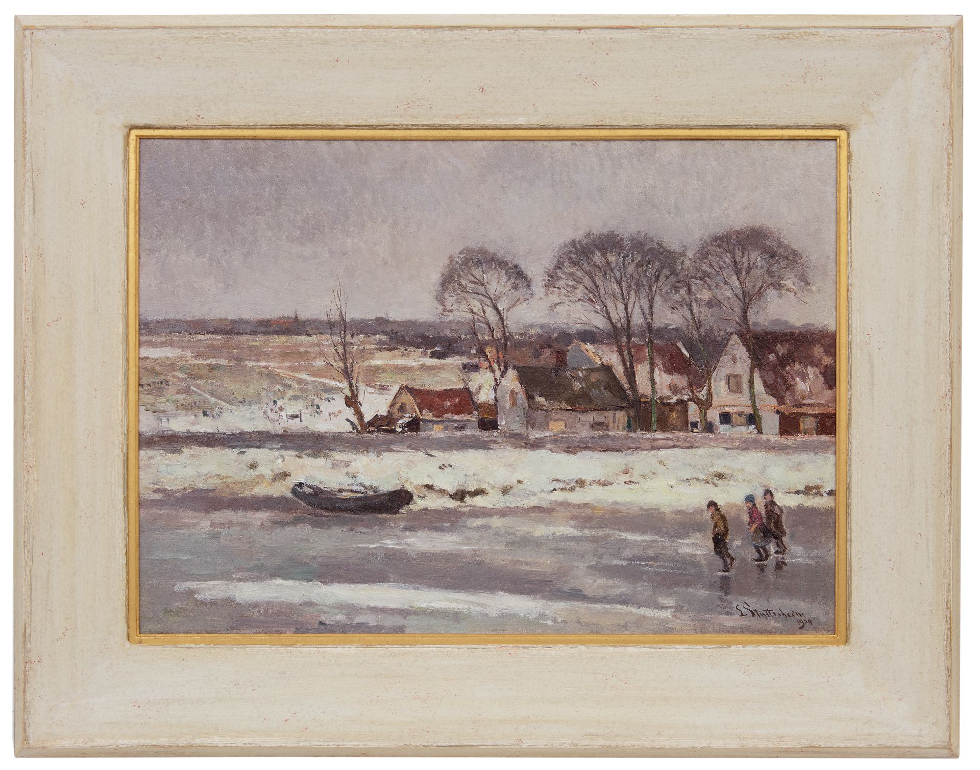Louis Stutterheim kunstwerk • schilderij • voorheen te koop Kinderen schaatsend op een vaart bij Nieuwkoop