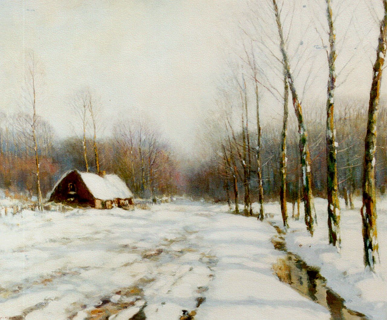 Louis van Soest kunstwerk • schilderij • voorheen te koop Besneeuwd bosgezicht met boerderij