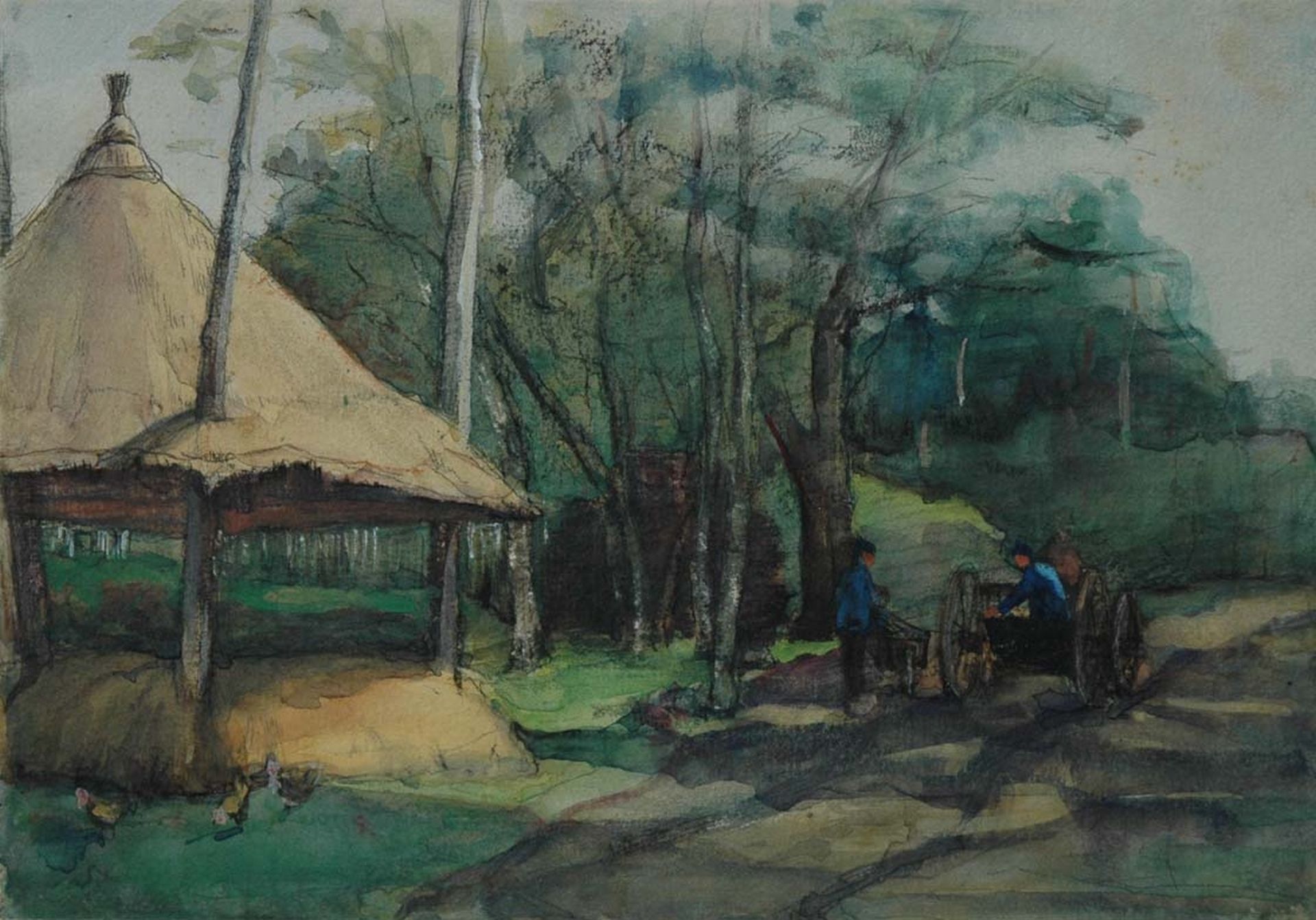 Louise Fritzlin kunstwerk • aquarel • tekening • voorheen te koop Boeren bij hooiberg
