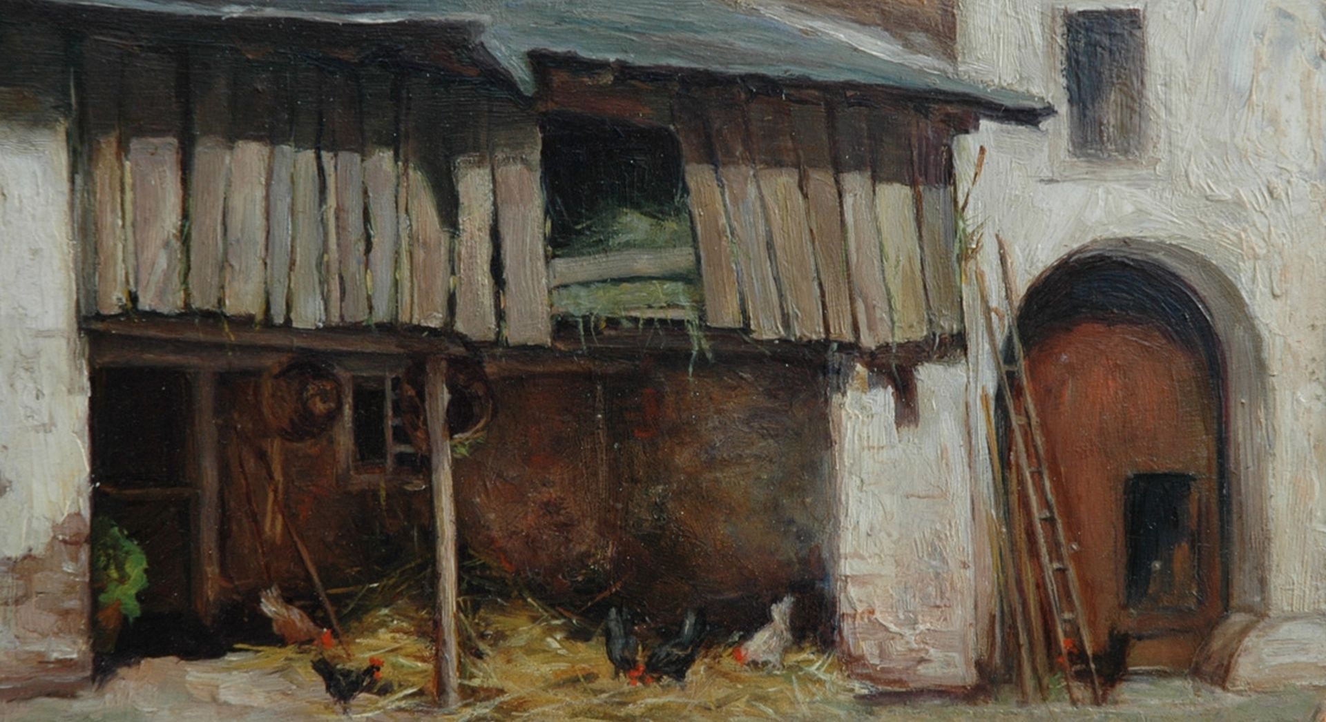 Louise Fritzlin kunstwerk • schilderij • voorheen te koop Boerenerf met kippen in de Eiffel