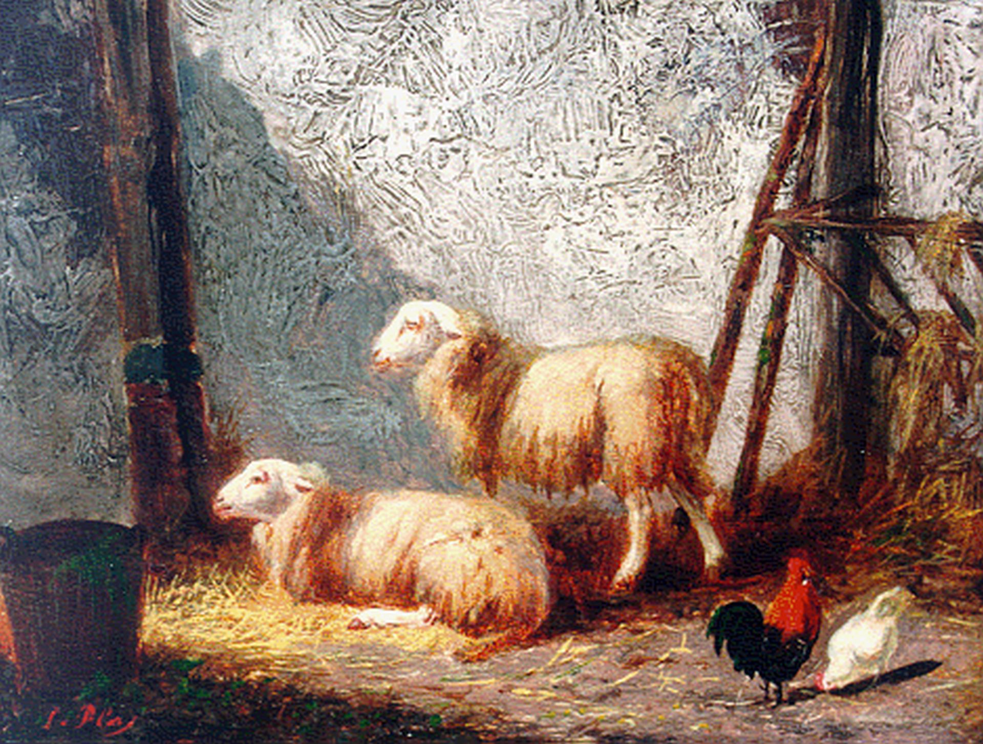 Louwerencius Plas kunstwerk • schilderij • voorheen te koop Schapen en kippen in de stal