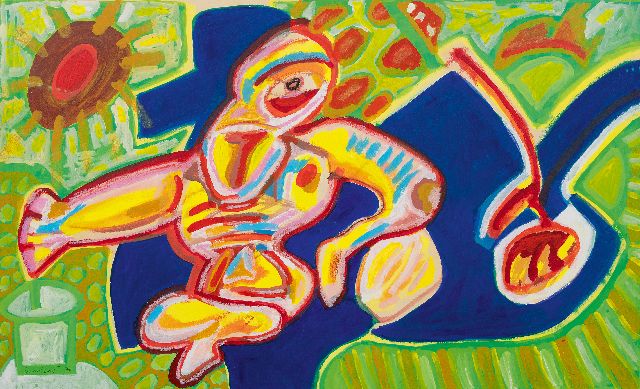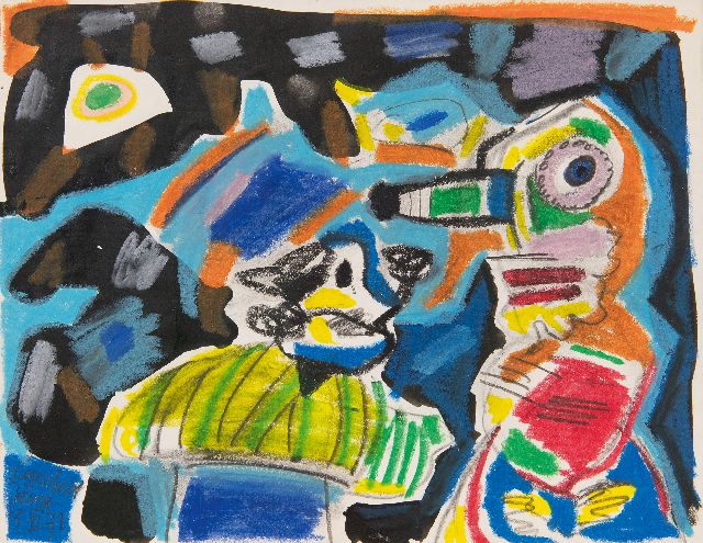 Lucebert was een experimenteel schilder-tekenaar-dichter en in die laatste hoedanigheid één van de hoofdfiguren van de CoBrA-beweging. Zijn werk wordt gekenmerkt door een grote vrijheid en spontaniteit. Hij schilderde wat er in hem opkwam, zonder zich te houden aan vaste motieven. Vanaf de jaren 50 bouwde hij zijn tekeningen en gouaches op uit stippels, lijnen en krassen, waar overheen de - bewust - onbeholpen vormen van lichamen van mensen en fantasiewezens werden geschilderd. Zijn sterk experimentele inslag bracht met zich mee dat Lucebert ook op veel andere gebieden actief was: hij fotografeerde, maakte keramiek, schreef toneelteksten en maakte monumentale wandschilderingen.