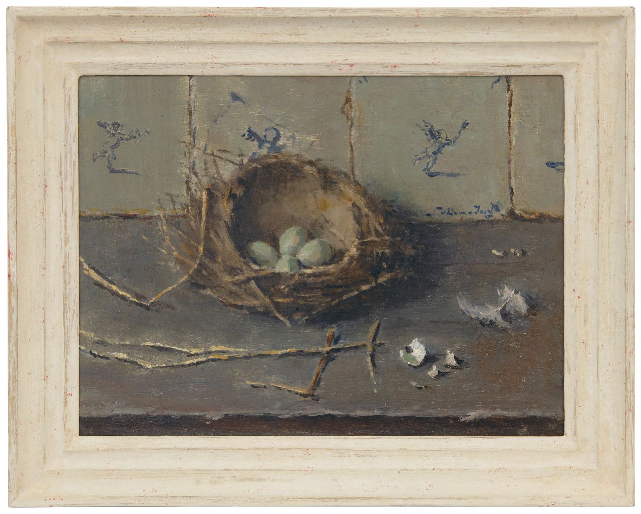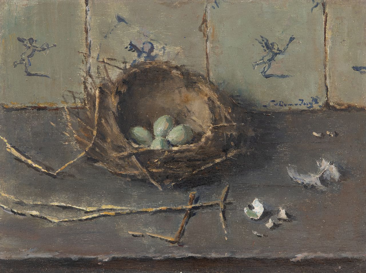 Lucie van Dam van Isselt kunstwerk • schilderij • voorheen te koop Eieren in een vogelnestje bij Hollandse tegeltjes