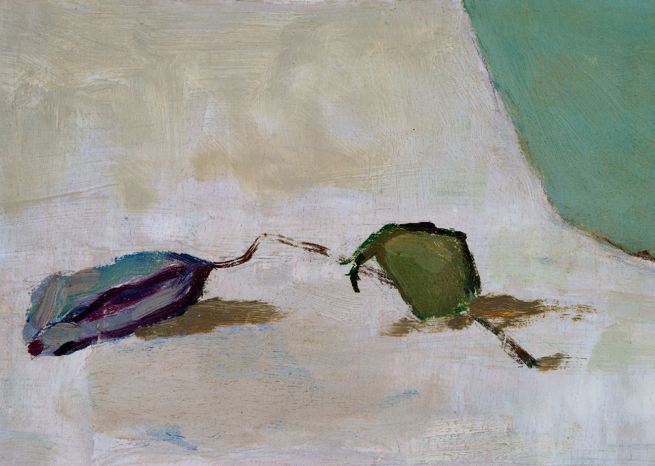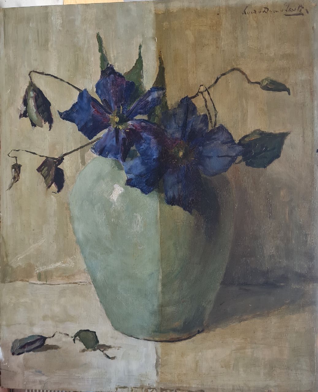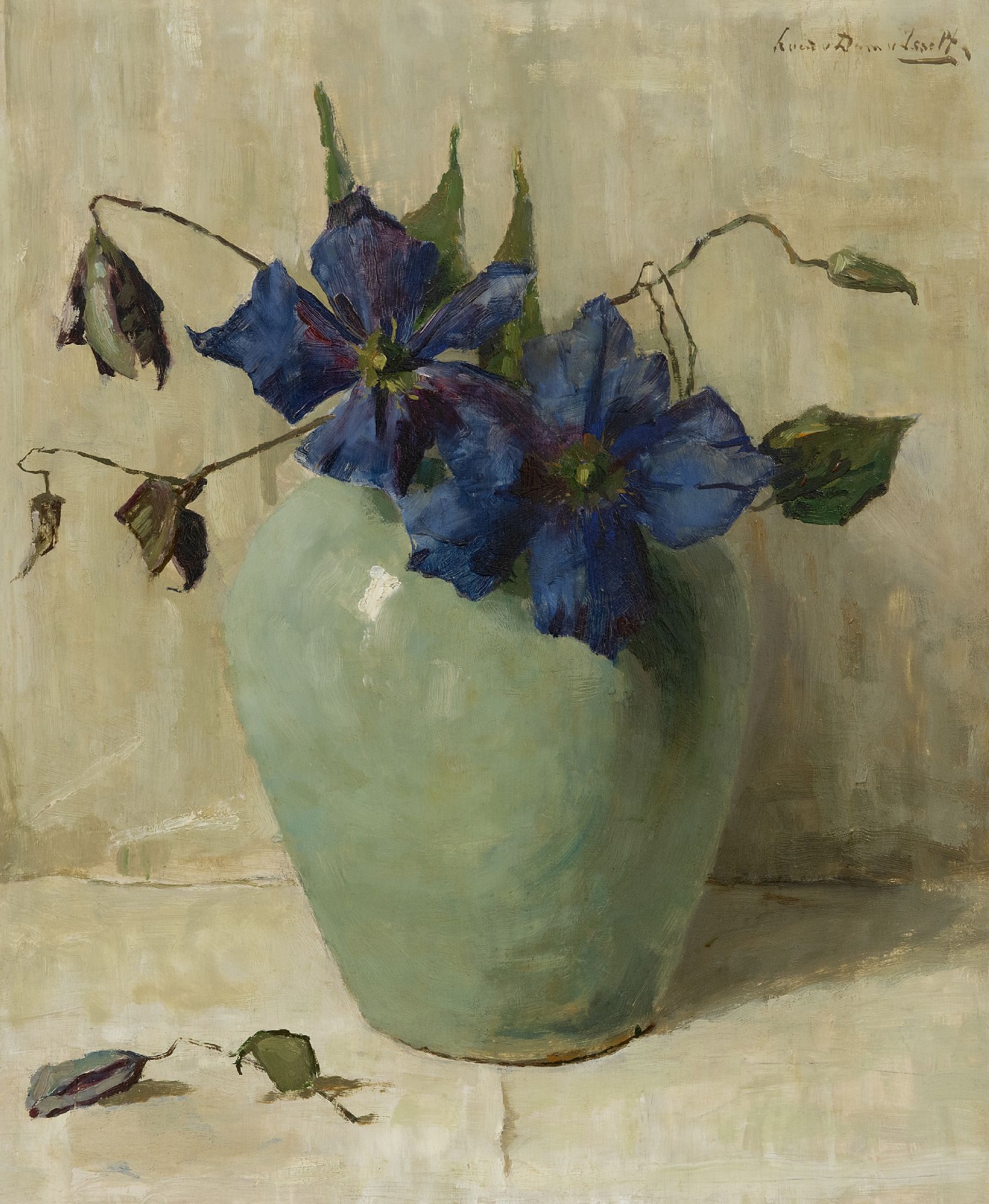 Lucie van Dam van Isselt kunstwerk • schilderij • voorheen te koop Paarse Clematis in celadongroene vaas