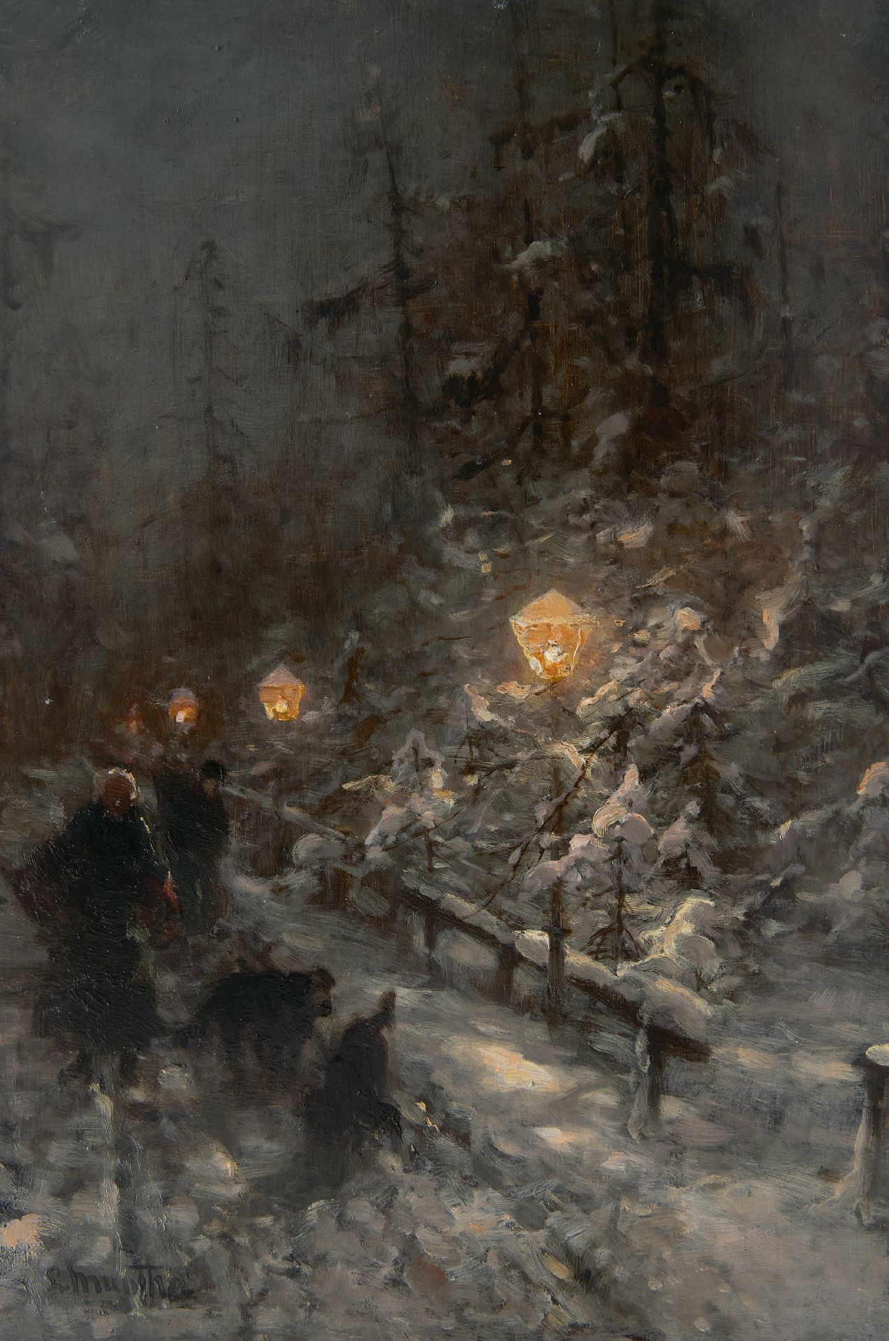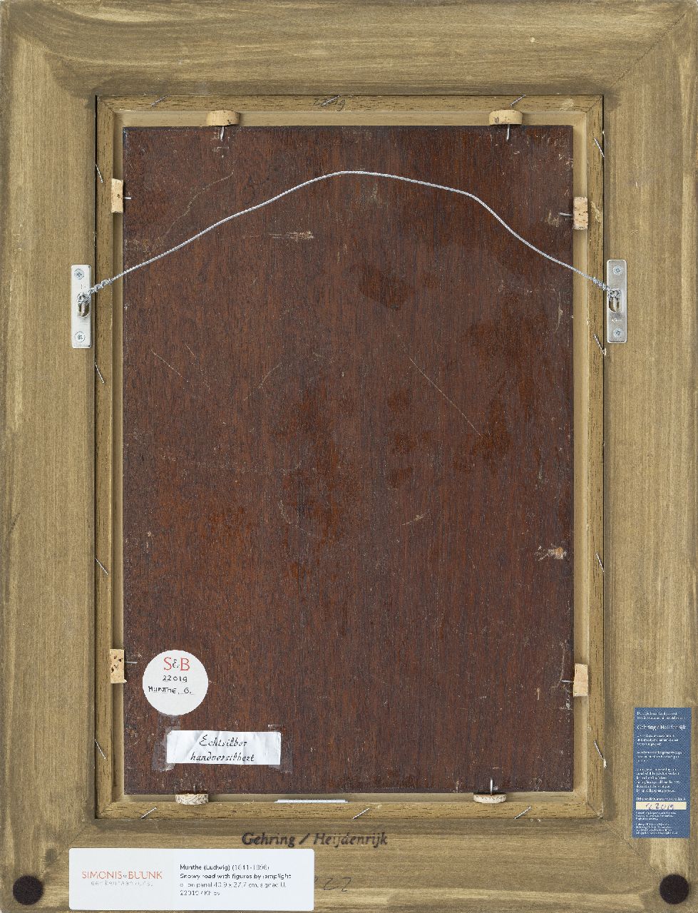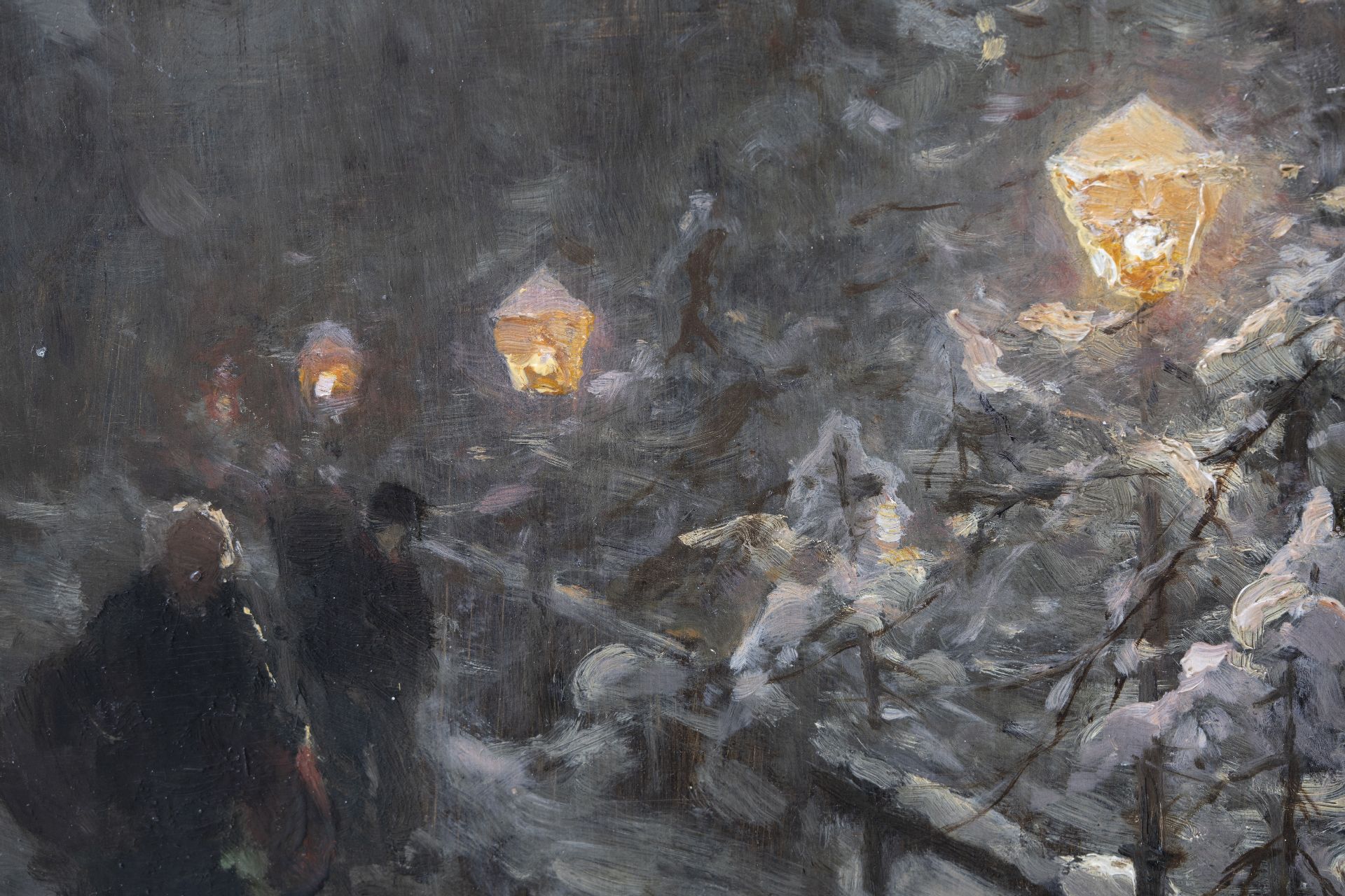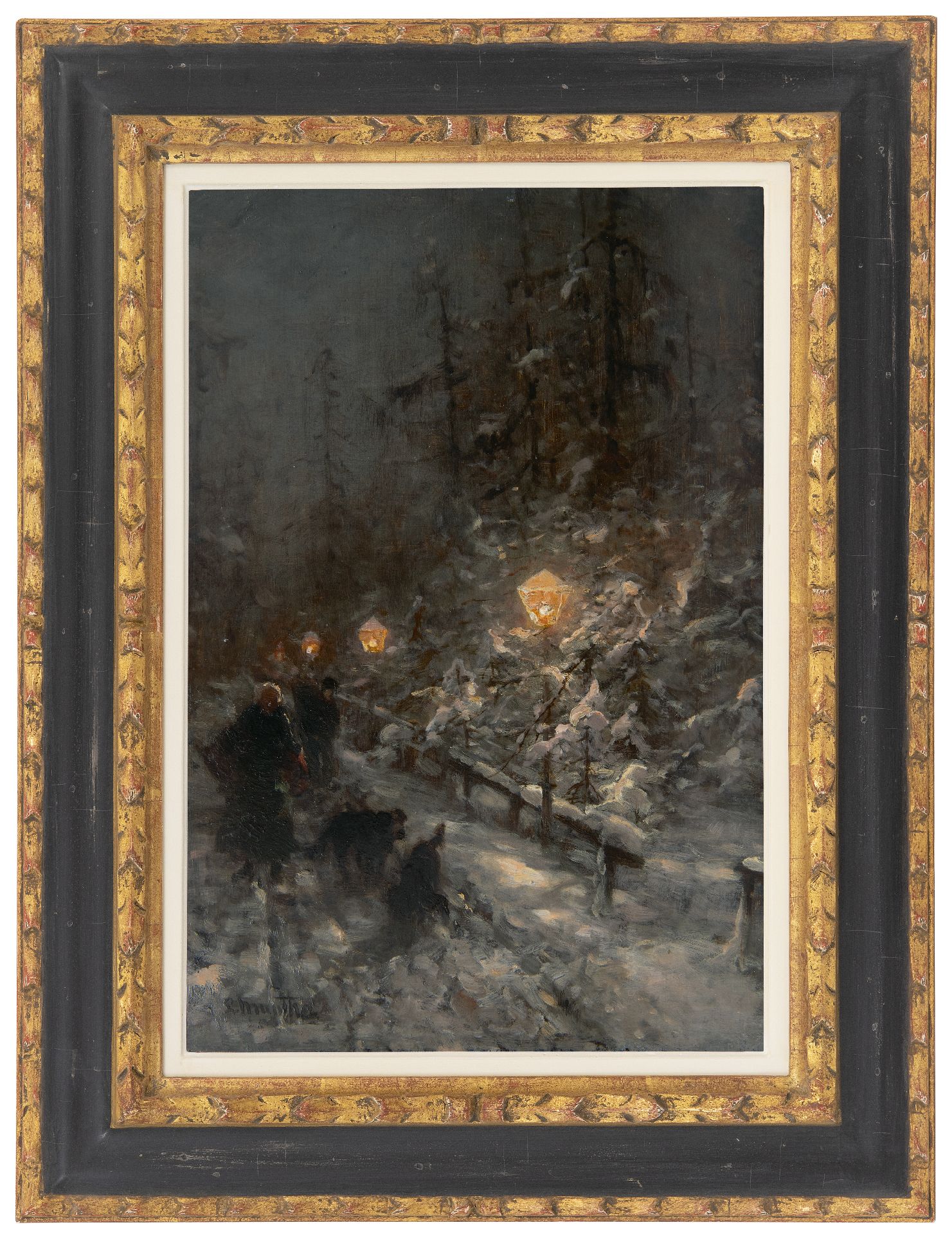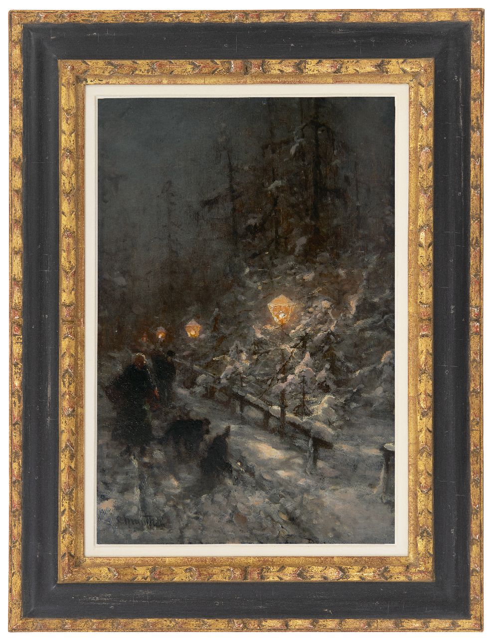 Ludwig Munthe kunstwerk • schilderij • voorheen te koop Besneeuwde weg met figuren bij lamplicht